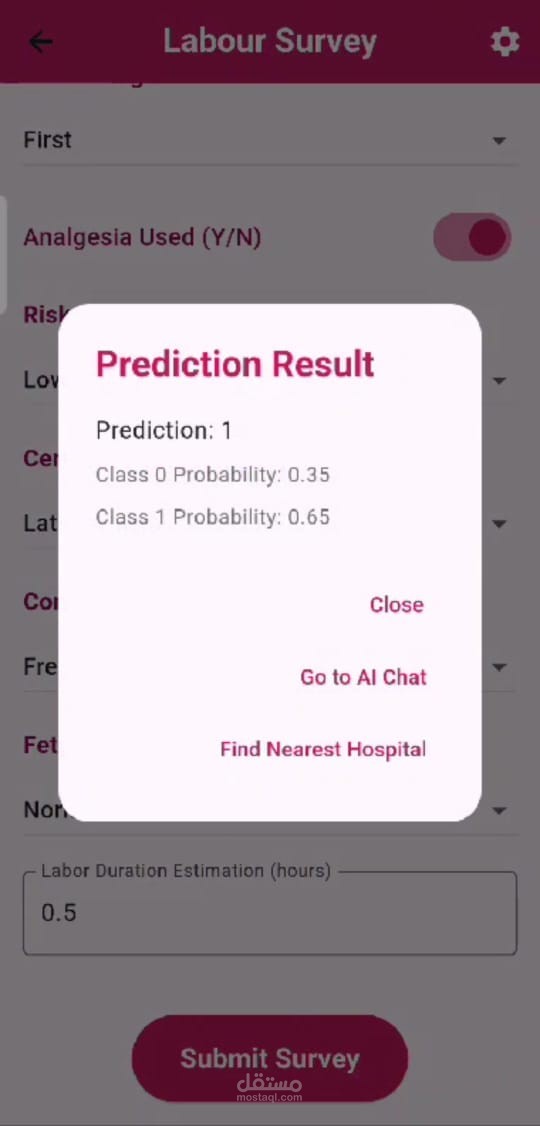 المشروع يقدم حلولًا عملية في المجال الطبي من خلال الذكاء الاصطناعي، لدعم اتخاذ القرار والتنبؤ بنتائج الولادة مع إرشاد المريضة للمستشفى المناسب.