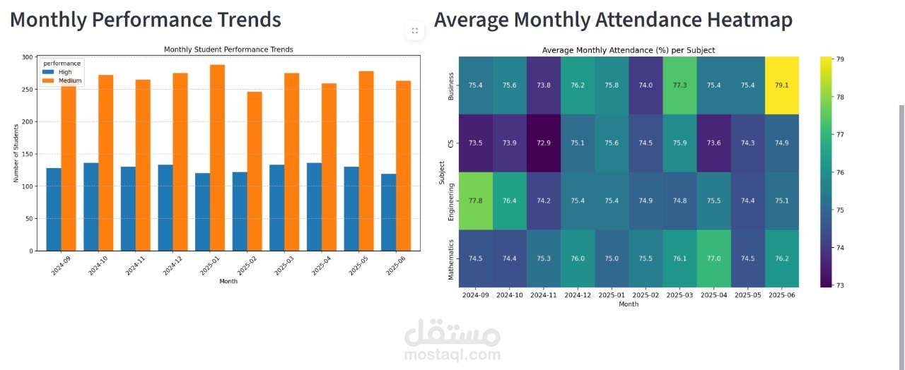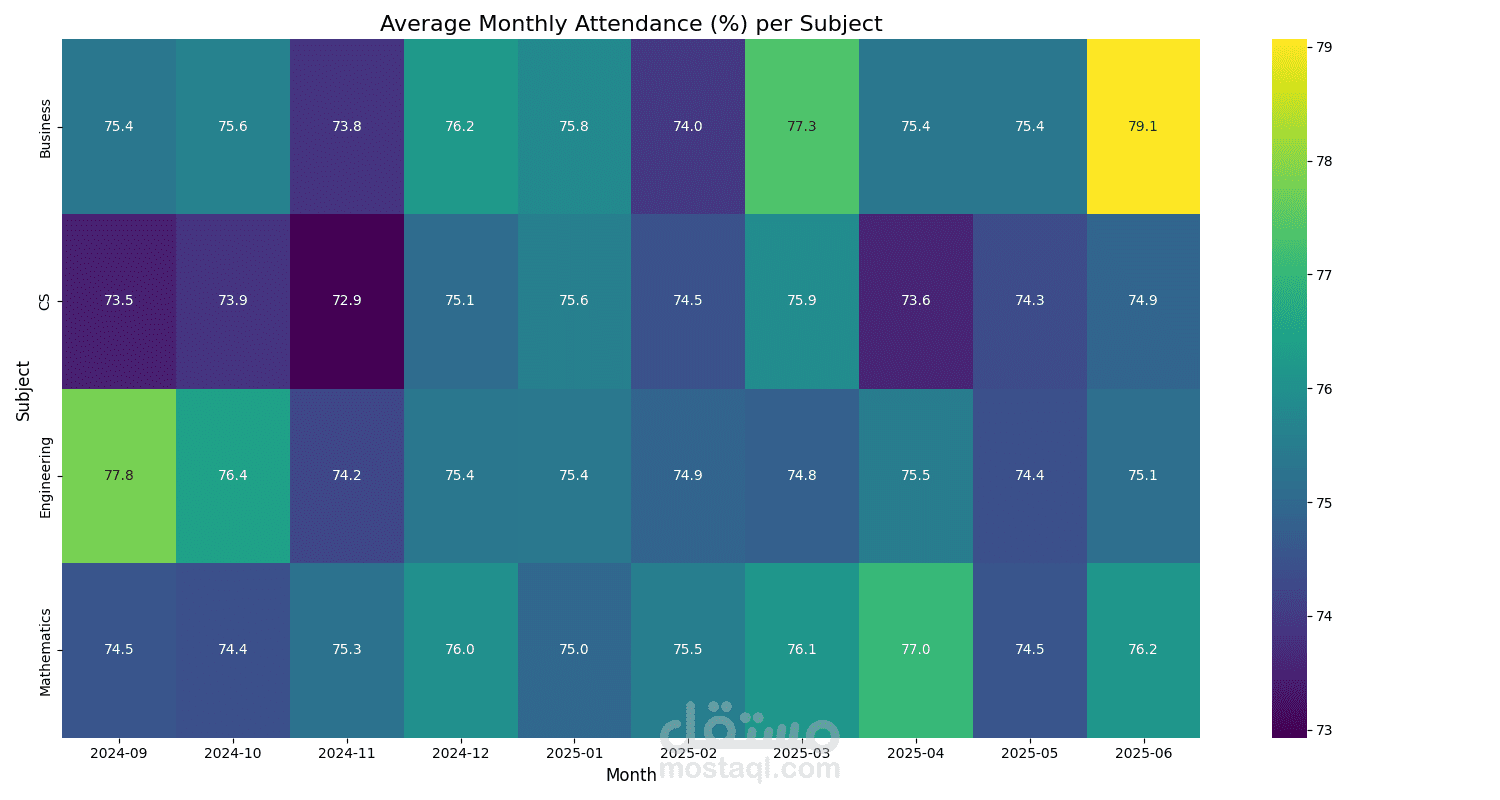 تحليل الحضور والغياب: خريطة حرارية (Heatmap) توضح كثافة حضور الطلاب خلال أيام الأسبوع والأسابيع.