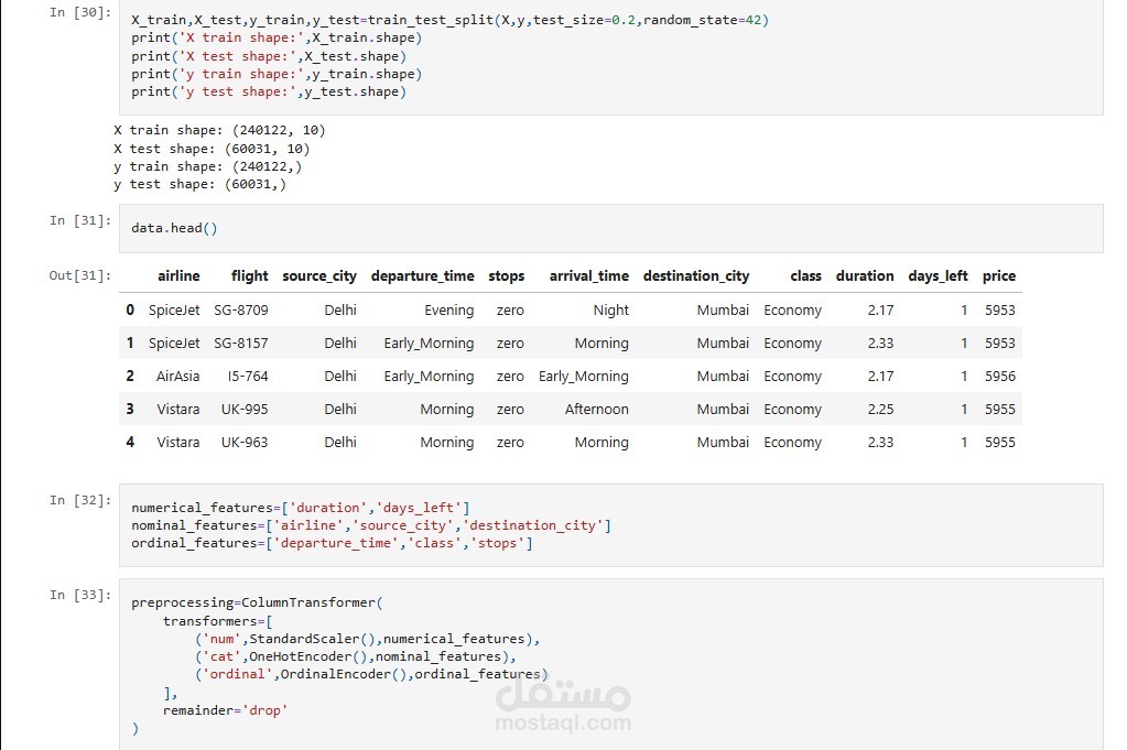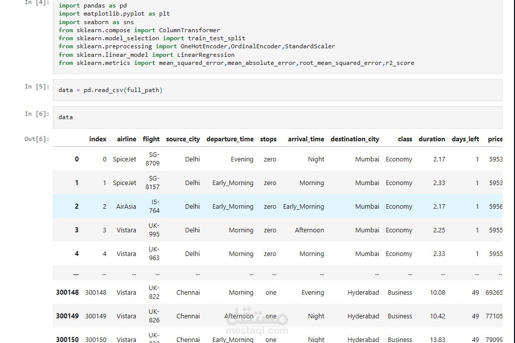 - جمع البيانات: بيانات رحلات طيران تتضمن (شركة الطيران، تاريخ ووقت الرحلة، المصدر والوجهة، عدد التوقفات، مدة الرحلة، السعر).