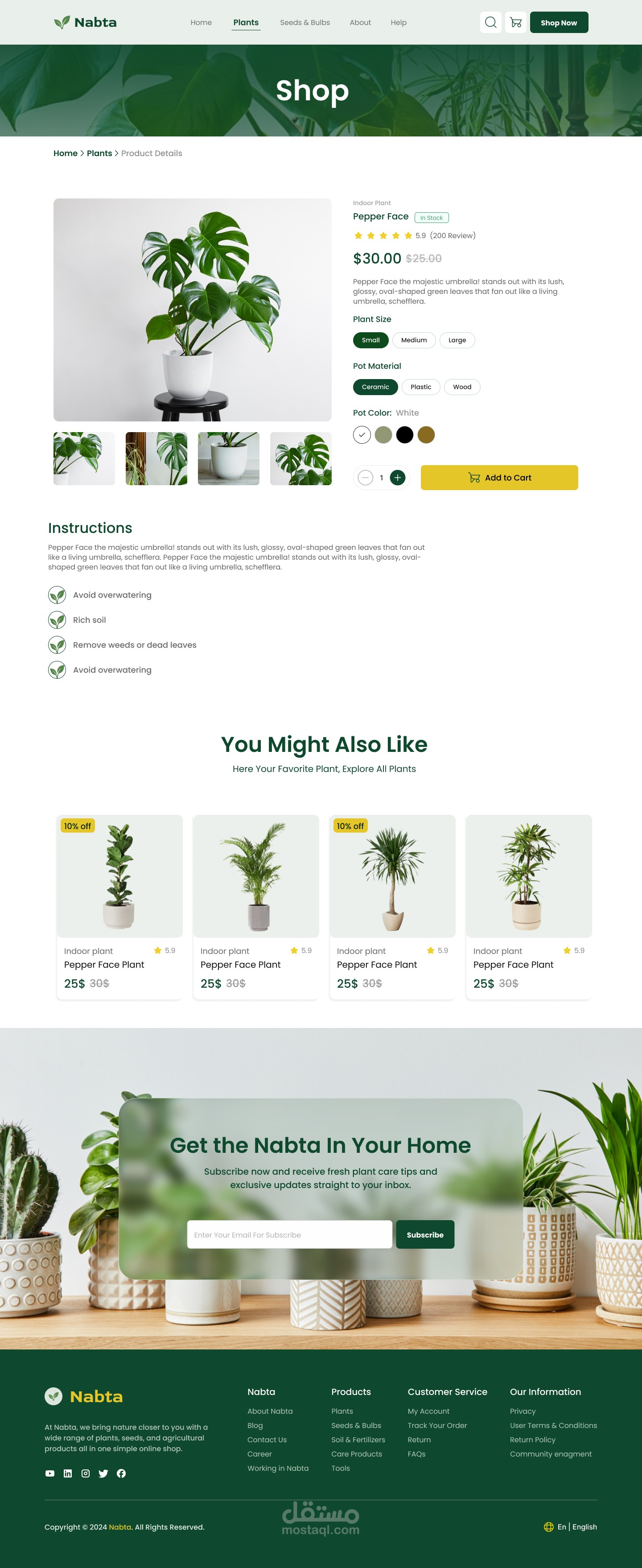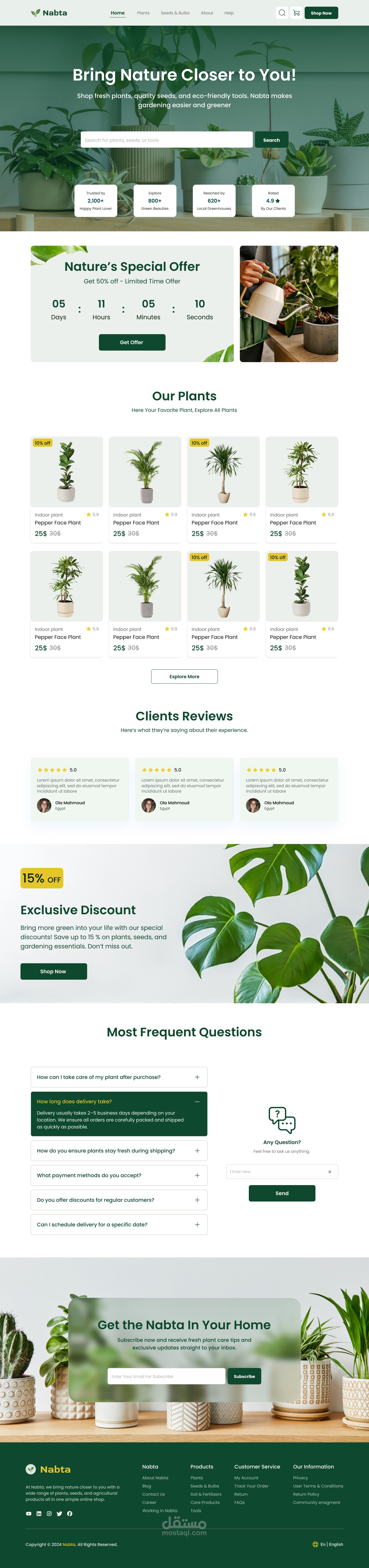 نبتة هو موقع تجارة إلكترونية متخصص في مجال الزراعة والبستنة. يوفّر مجموعة واسعة من المنتجات تشمل النباتات، البذور، التربة، الأسمدة، وأدوات الزراعة. تم تصميم الموقع بواجهة حديثة وسهلة الاستخدام، مع تقسيم واضح للفئات، وخاصية البحث، وبانرات للخصومات، وقسم لآراء العملاء، وصفحة للأسئلة الشائعة، بالإضافة إلى عملية شراء بسيطة وسلسة. الهدف من المشروع هو تقديم تجربة تسوق متكاملة لعشاق الزراعة، بحيث يجدون كل ما يحتاجونه في مكان واحد