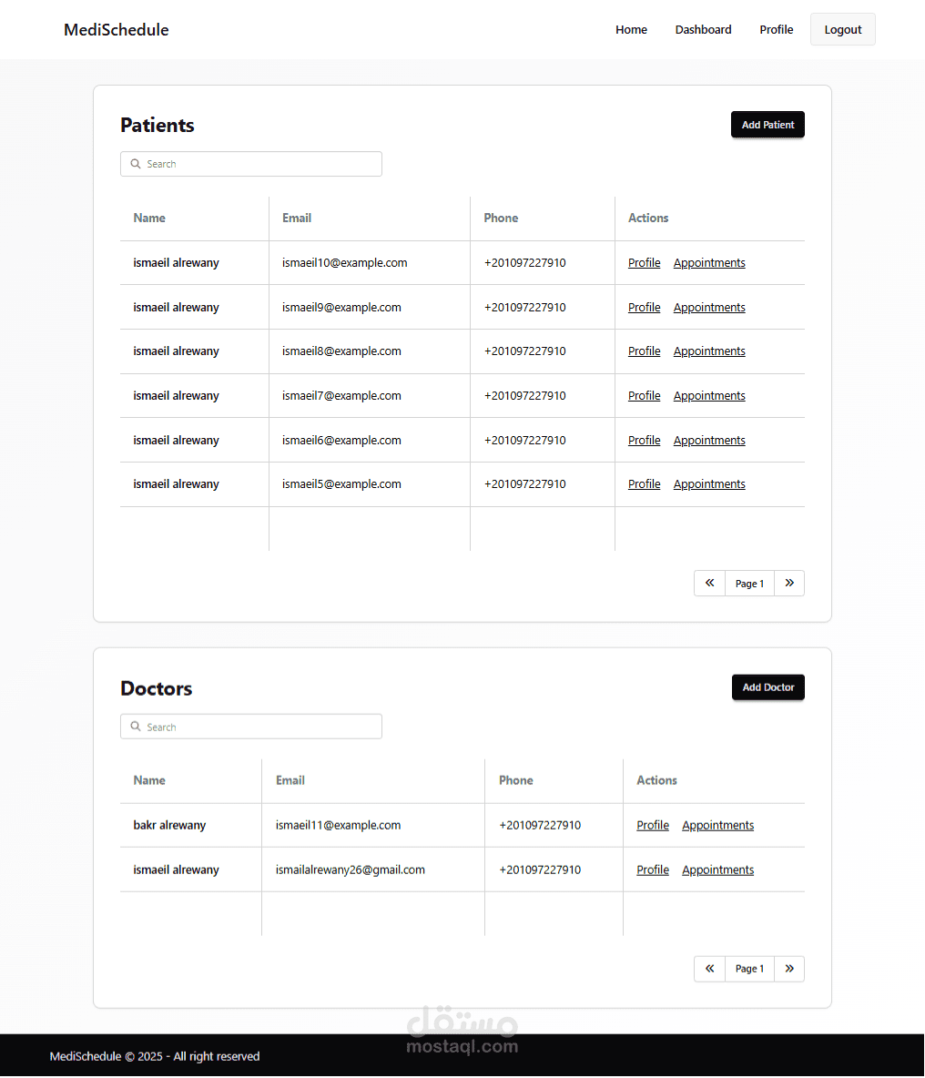 إدارة شاملة للمواعيد: يوفر التطبيق لوحة تحكم سهلة الاستخدام لكل مستخدم (مريض أو طبيب) لعرض المواعيد القادمة والسابقة، مع إمكانية تعديلها أو إلغائها.