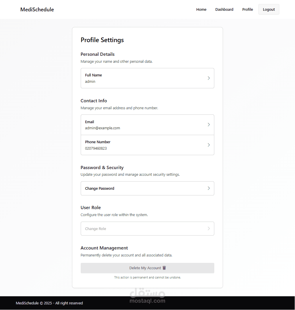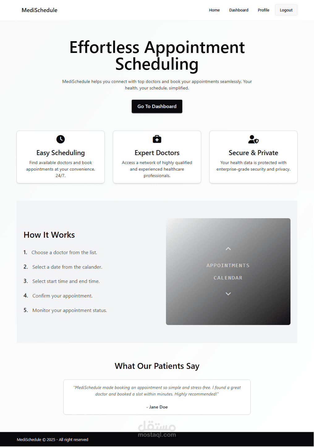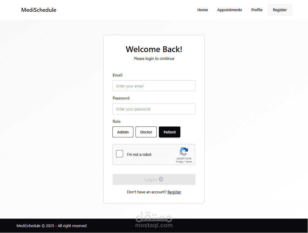 MediSchedule هو تطبيق ويب شامل تم تصميمه ليكون جسرًا تقنيًا بين المريض والعيادة، حيث يوفر منصة مركزية سهلة الاستخدام تتيح للمستخدمين حجز وإدارة مواعيدهم الطبية ببضع نقرات فقط.