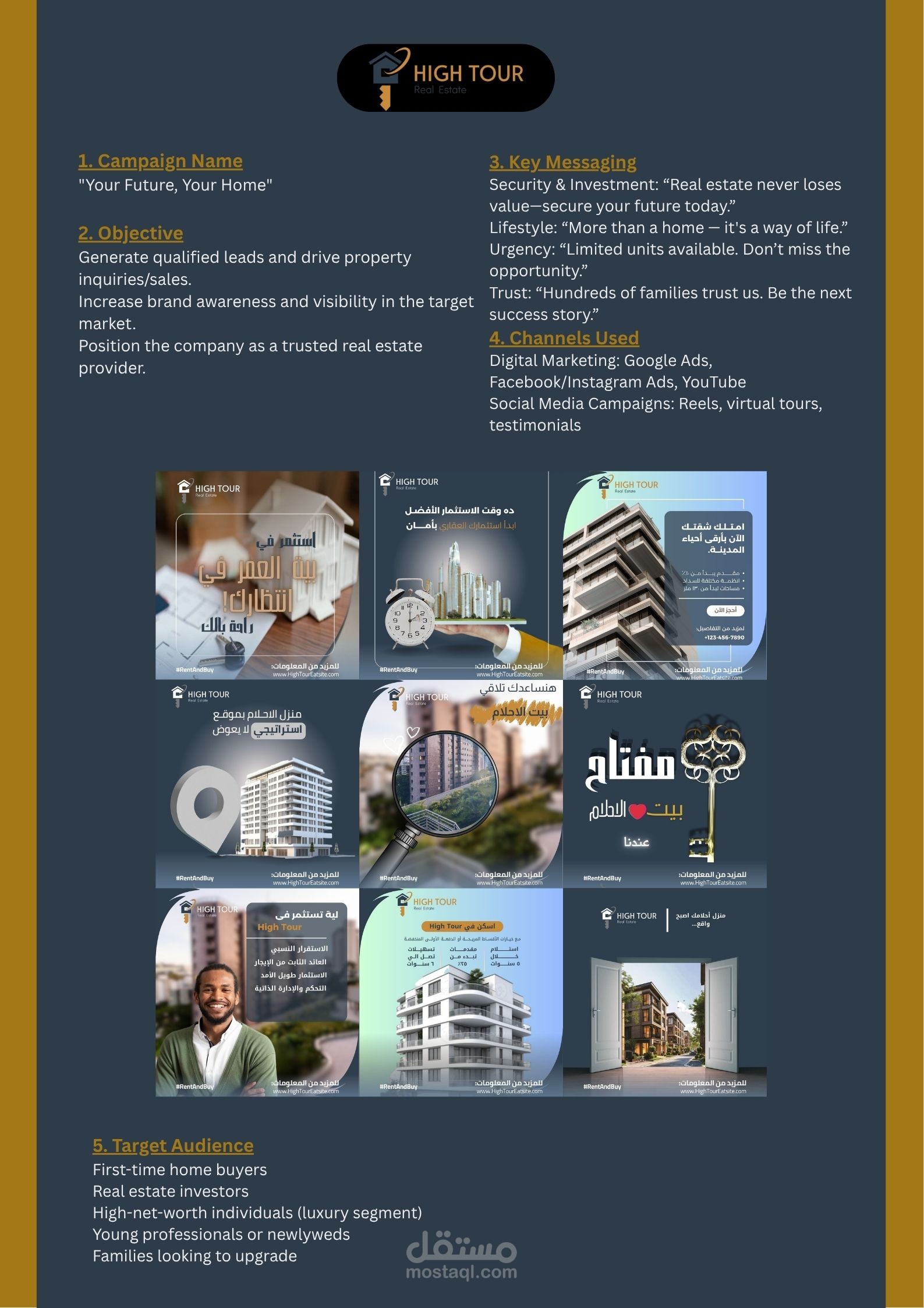 في مشروع High Tour | Real Estate Campaign، قمت بتصميم حملة كاملة لشركة عقارات، شاملة هوية بصرية وإعلانات موجهة للجمهور المهتم بالشراء أو التأجير. العمل اشمل: