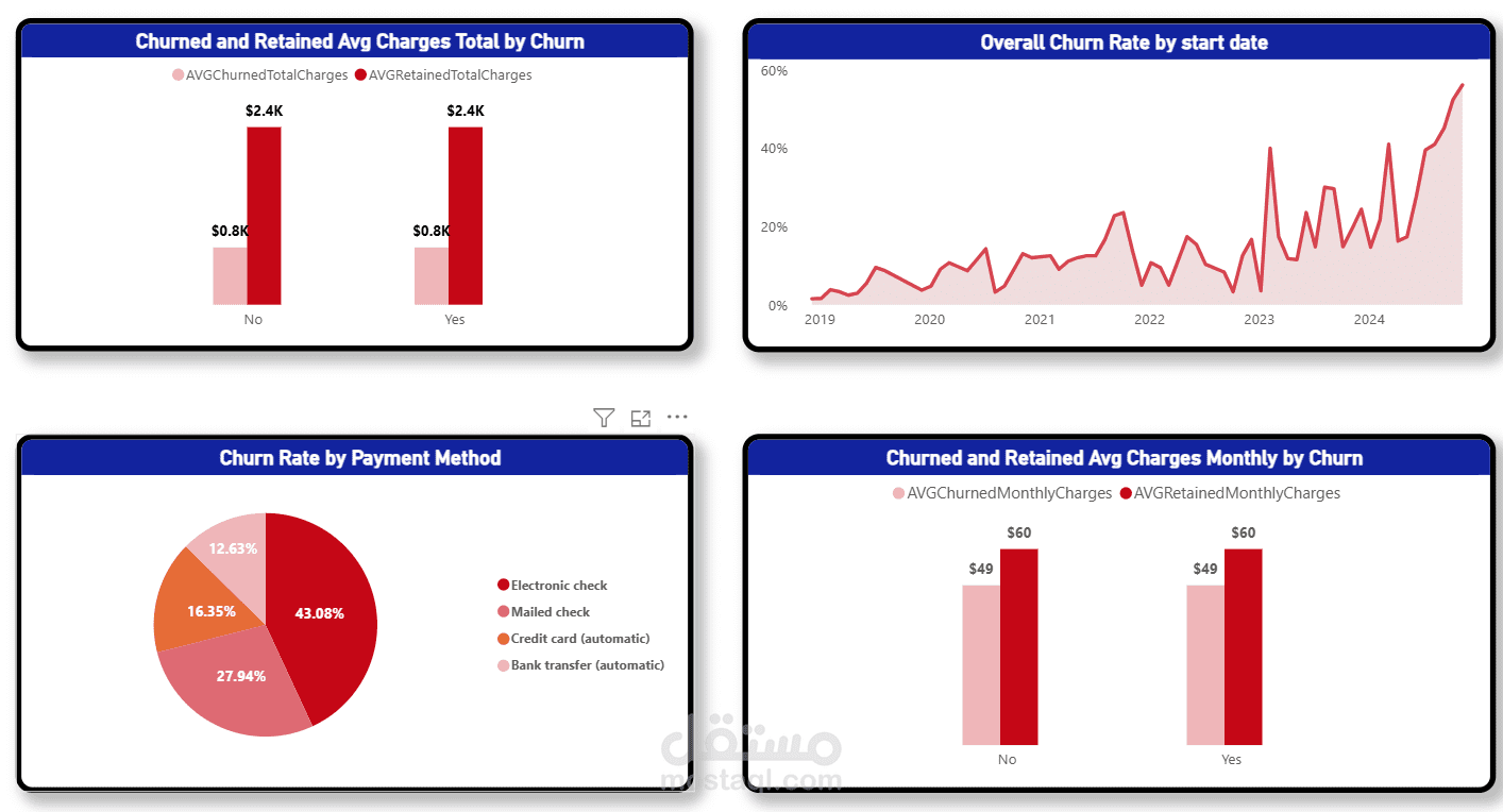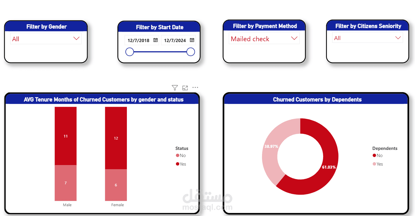 الداشبورد يتضمن عناصر تفاعلية مثل المخططات (Bar Charts, Pie Charts)، جداول ديناميكية، وأدوات تقطيع (Slicers) لتصفية البيانات حسب الفئات الديموغرافية أو الخدمات. الهدف هو تقديم رؤى واضحة لتحسين استراتيجيات الاحتفاظ بالعملاء، مع تصميم بصري جذاب وسهل الاستخدام. المشروع متاح للعرض على GitHub أو يمكن مشاركته كملف .pbix عند الطلب.