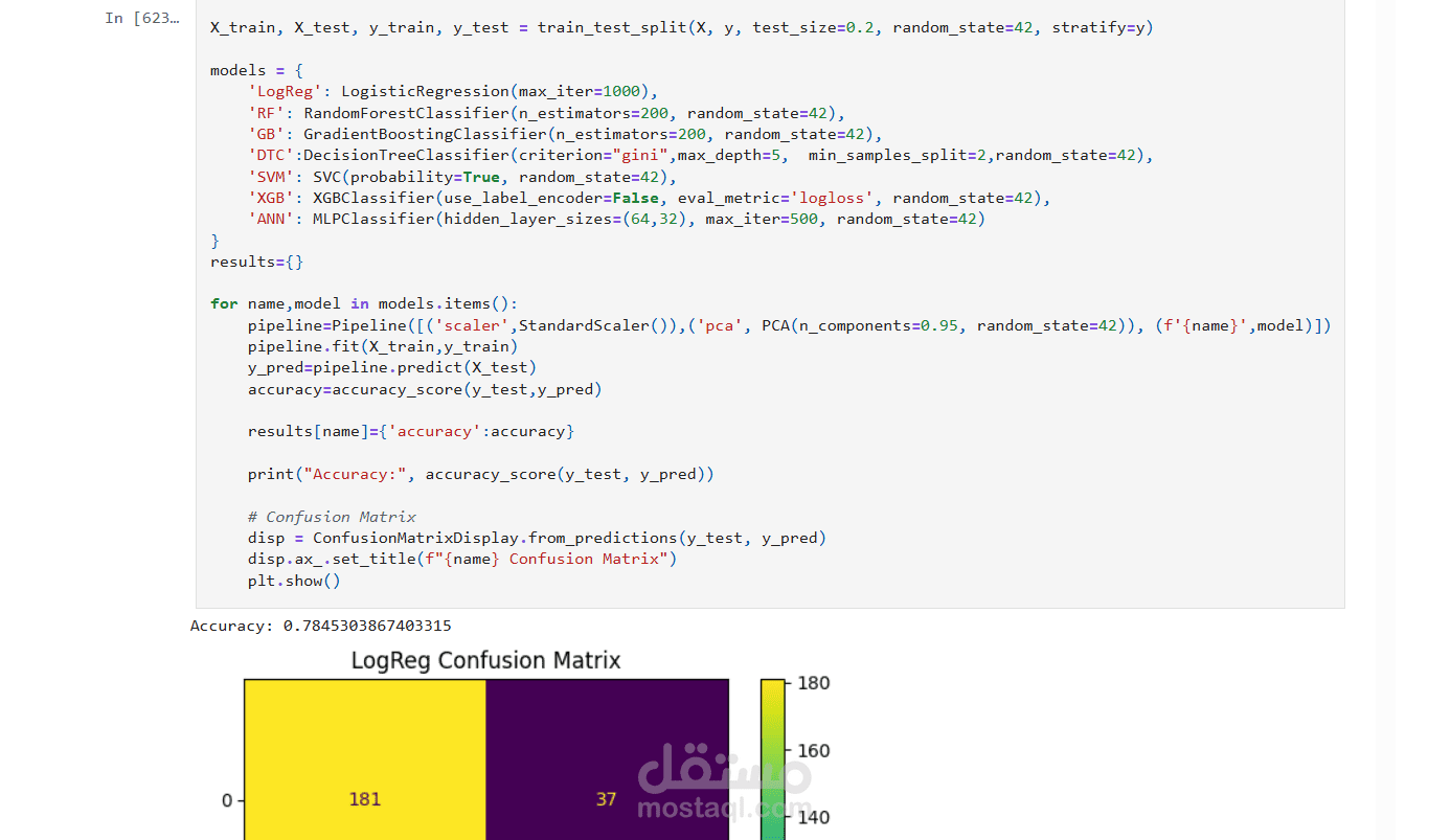 تدريب النماذج: اختبار عدة خوارزميات مثل: Logistic Regression, Decision Tree, Random Forest, Gradient Boosting, SVM, XGBoost, ANN.