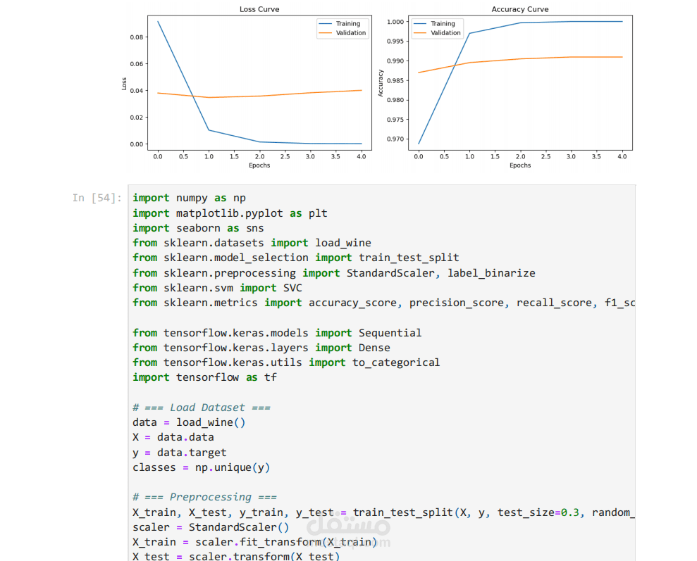كما تضمن المشروع تجربة إضافية على مجموعة بيانات النبيذ (Wine Dataset) لتصنيف الأنواع المختلفة باستخدام كل من SVM والشبكات العصبية، ومقارنة أدائهما في حالة التصنيف متعدد الفئات.