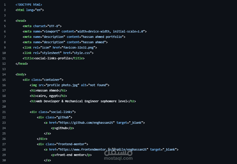 مشروع مصمم بلغة html &css لعمل موقع يجمع اهم روابط مواقع التواصل الاجتماعي ونبذة بسيطة عن الشخص