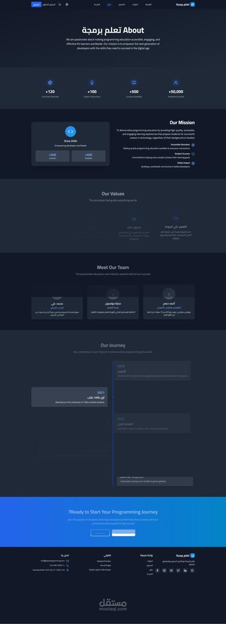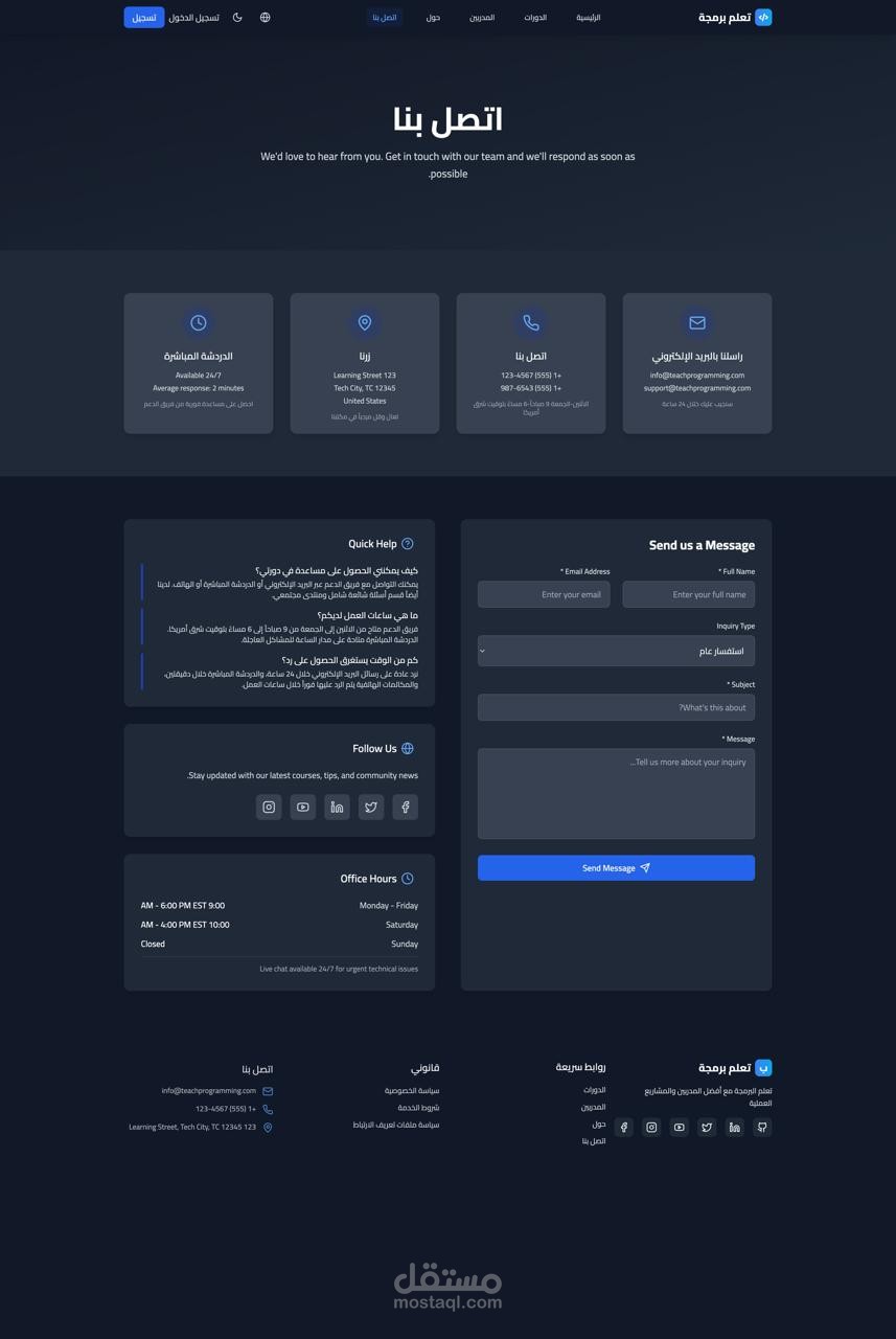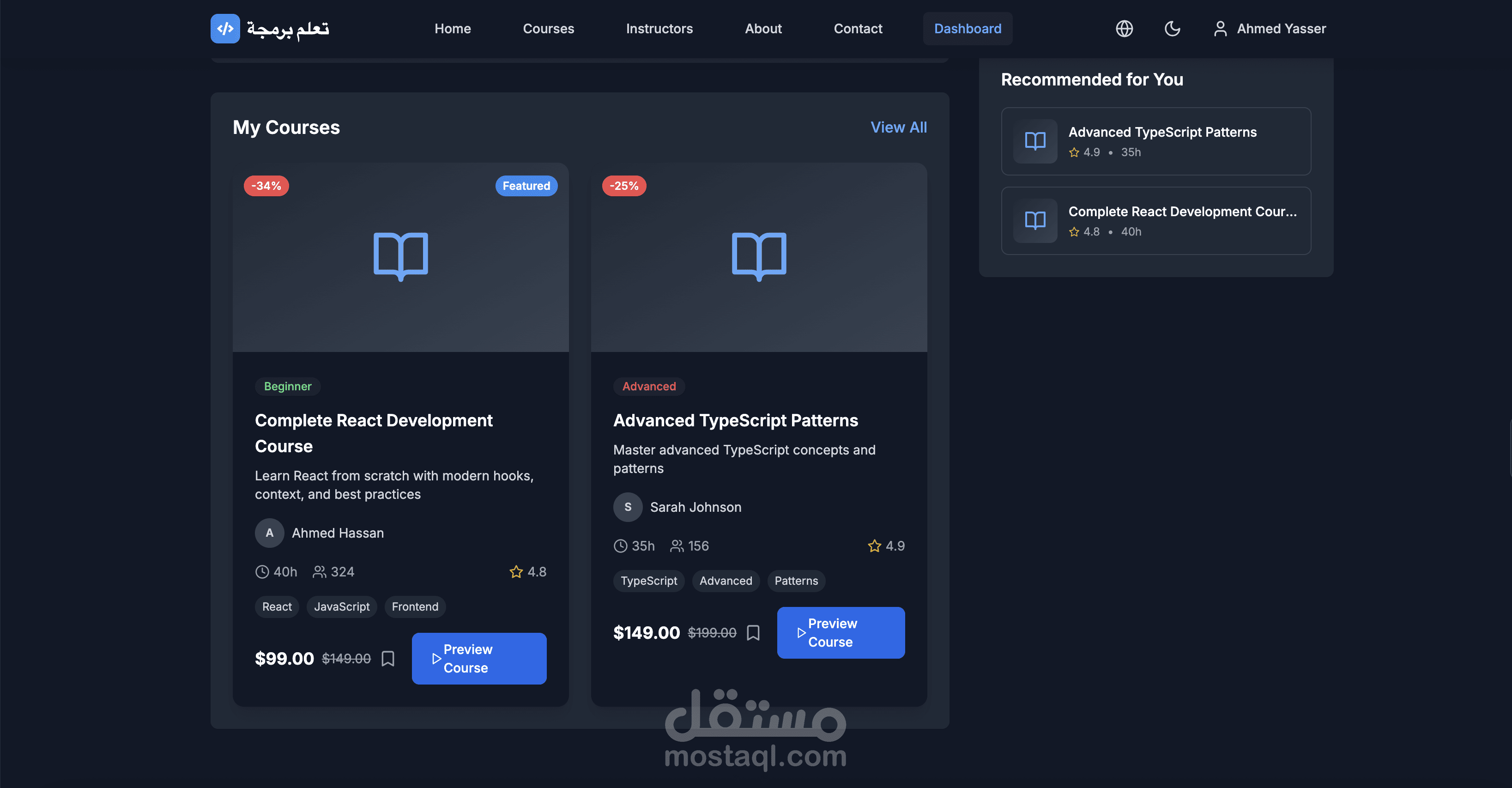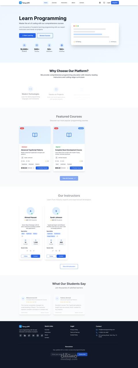 يحتوي على خصائص مثل تصفح الكورسات، ملفات المستخدمين (Dashboard)، وتعدد اللغات (عربية وإنجليزية)