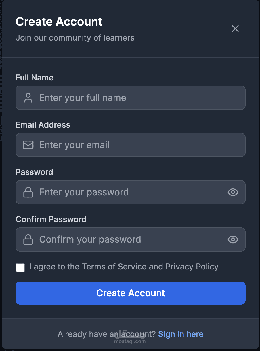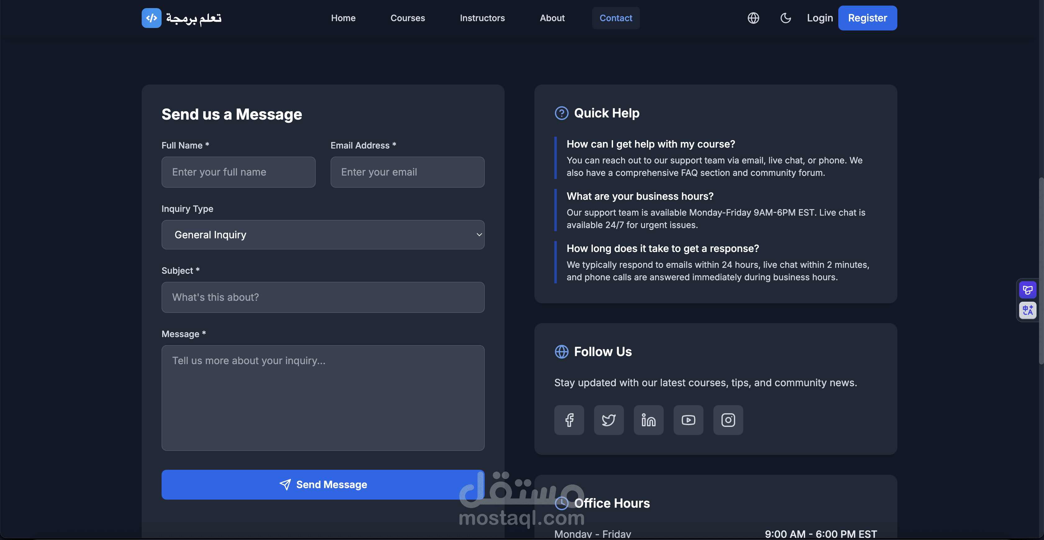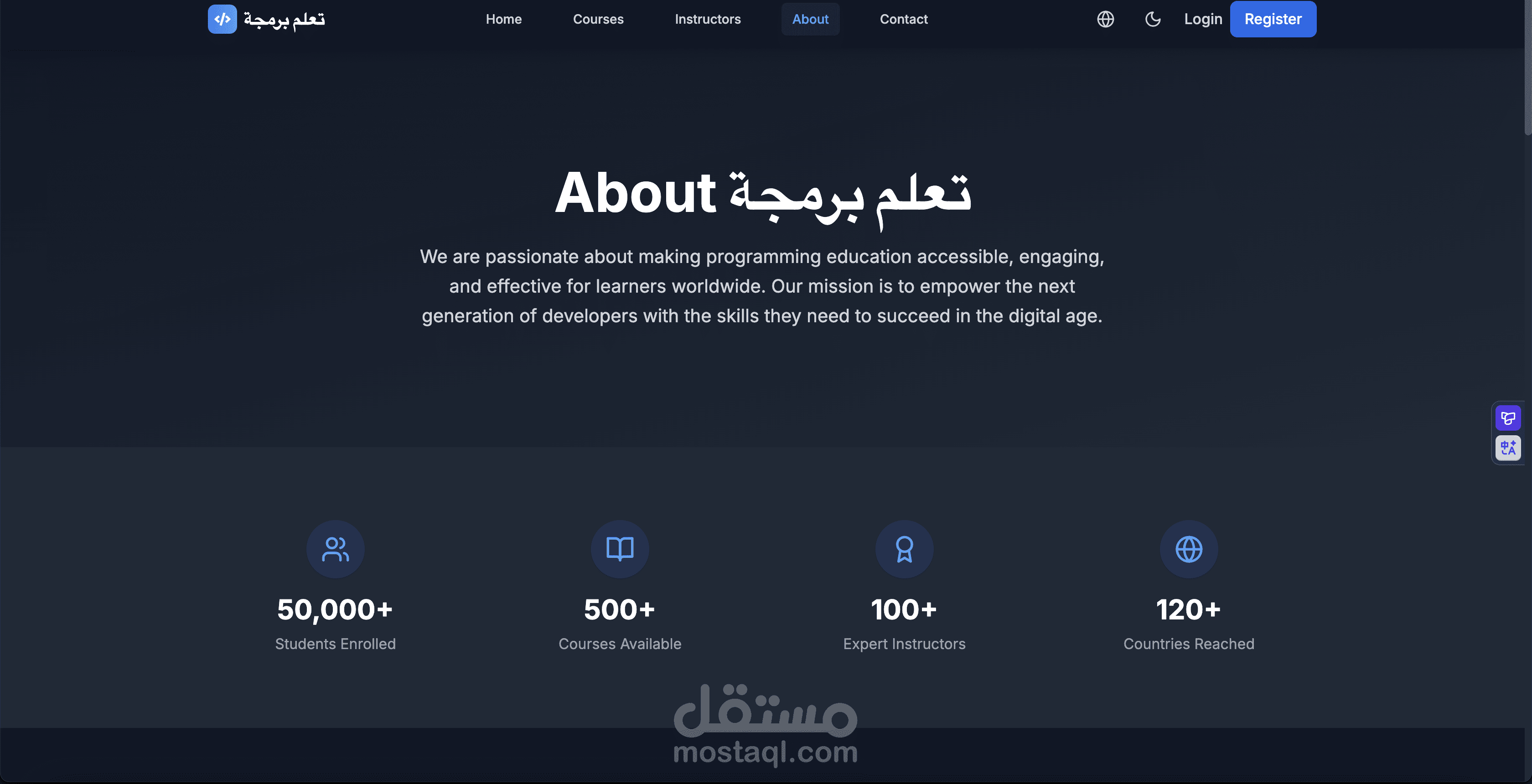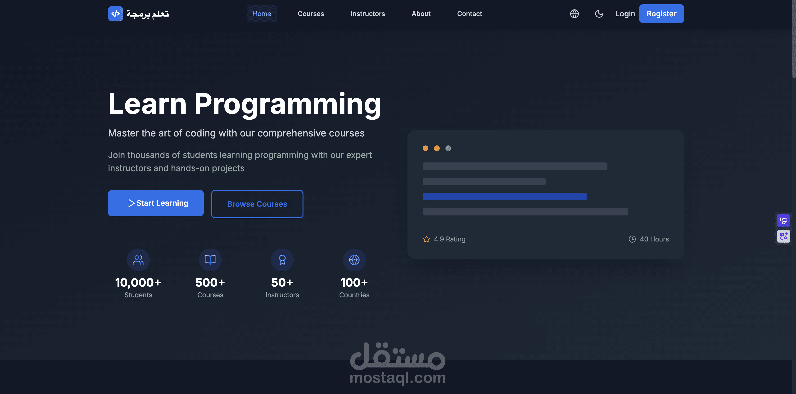 يحتوي على خصائص مثل تصفح الكورسات، ملفات المستخدمين (Dashboard)، وتعدد اللغات (عربية وإنجليزية)