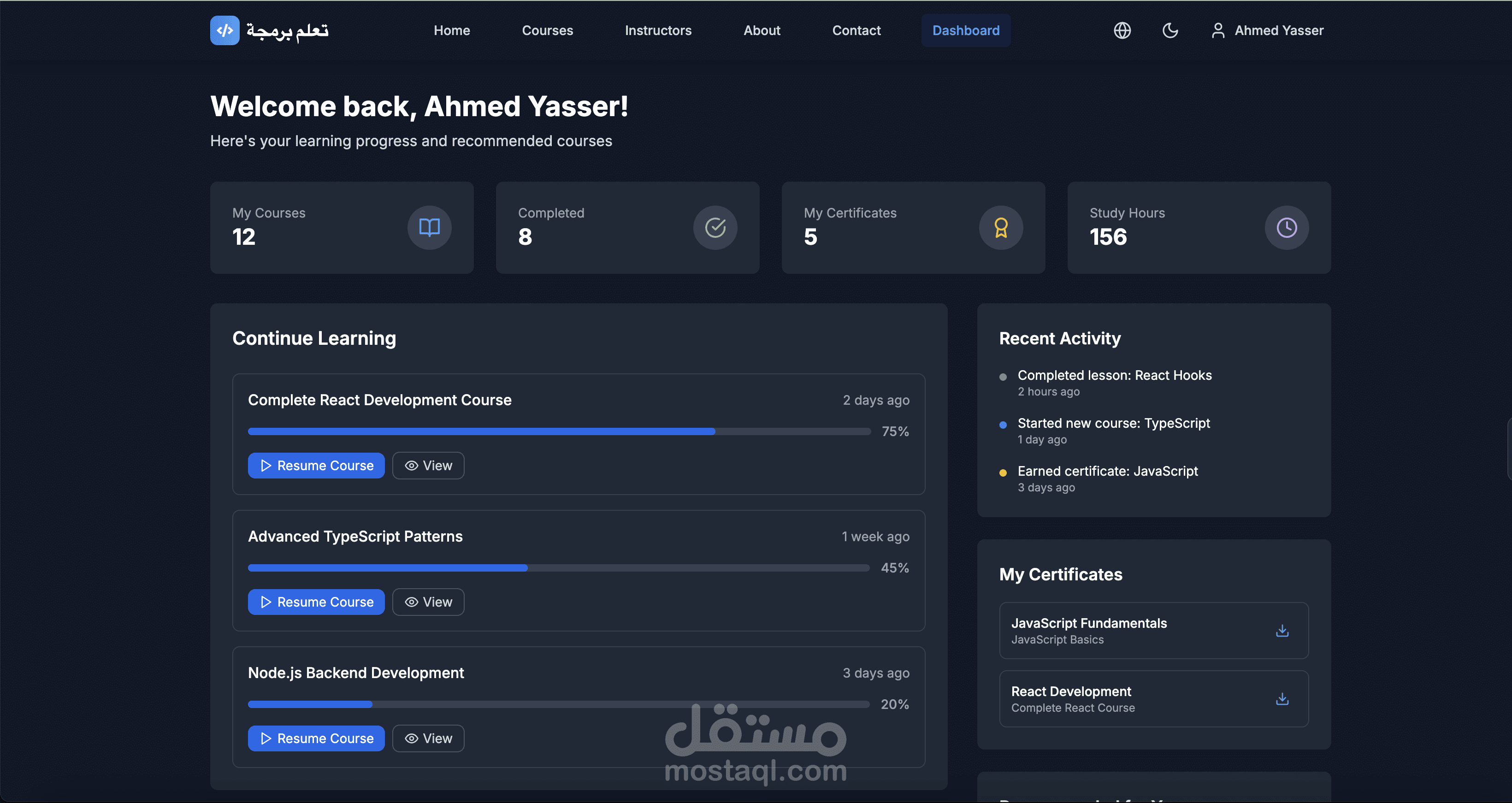 لوحة تحكم للمستخدم (User Dashboard) لعرض التقدم وإدارة الكورس.