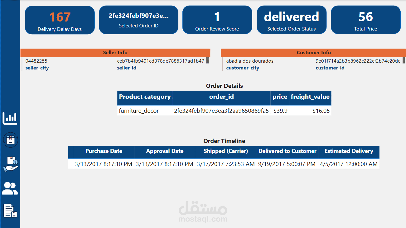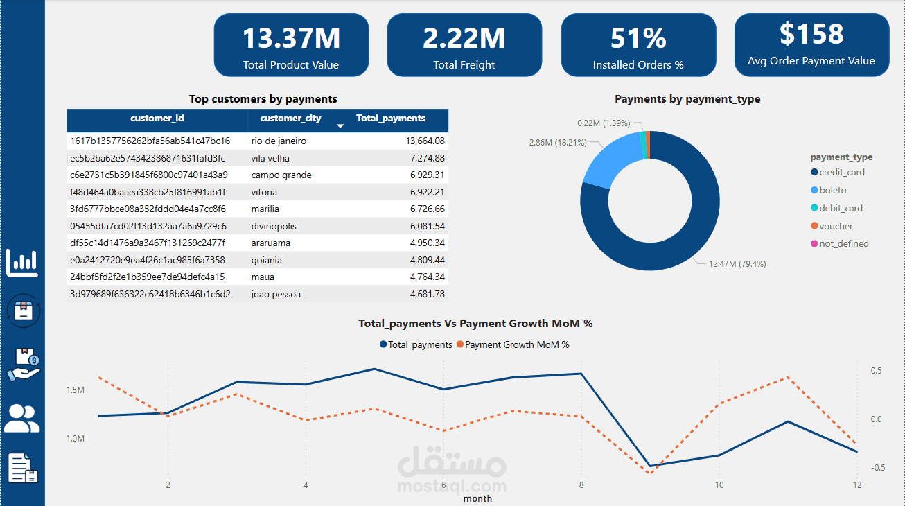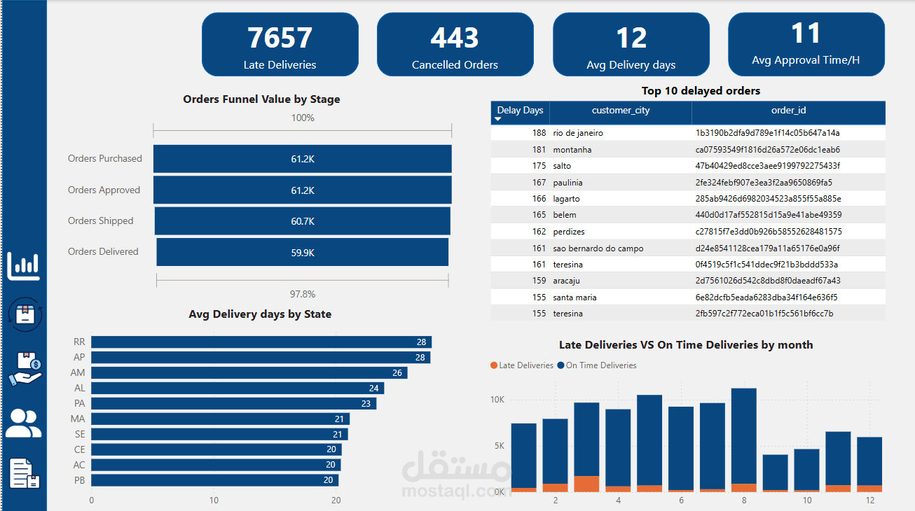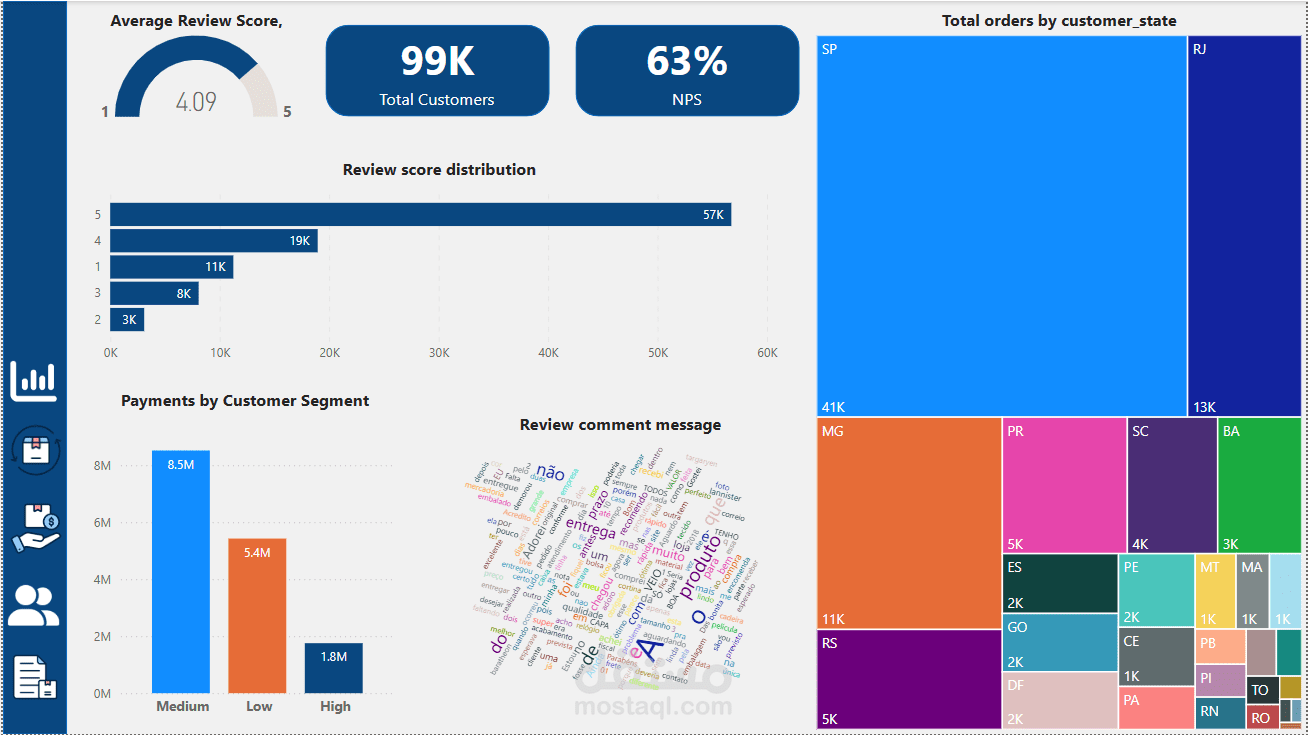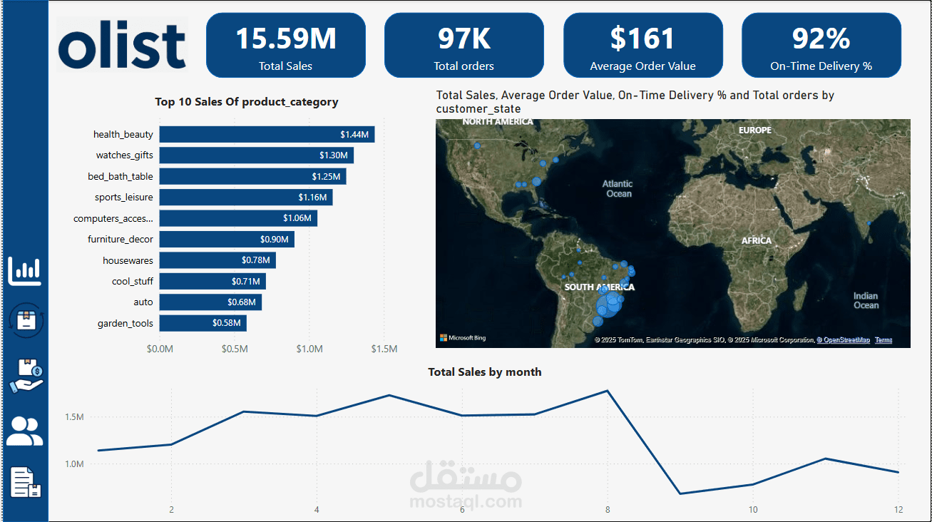 تقرير Power BI تفاعلي تم تصميمه وتحليله على بيانات متجر إلكتروني (Olist E-Commerce Dataset) بعد بنائه في Data Warehouse بأسلوب Dimensional Modeling (Star Schema).