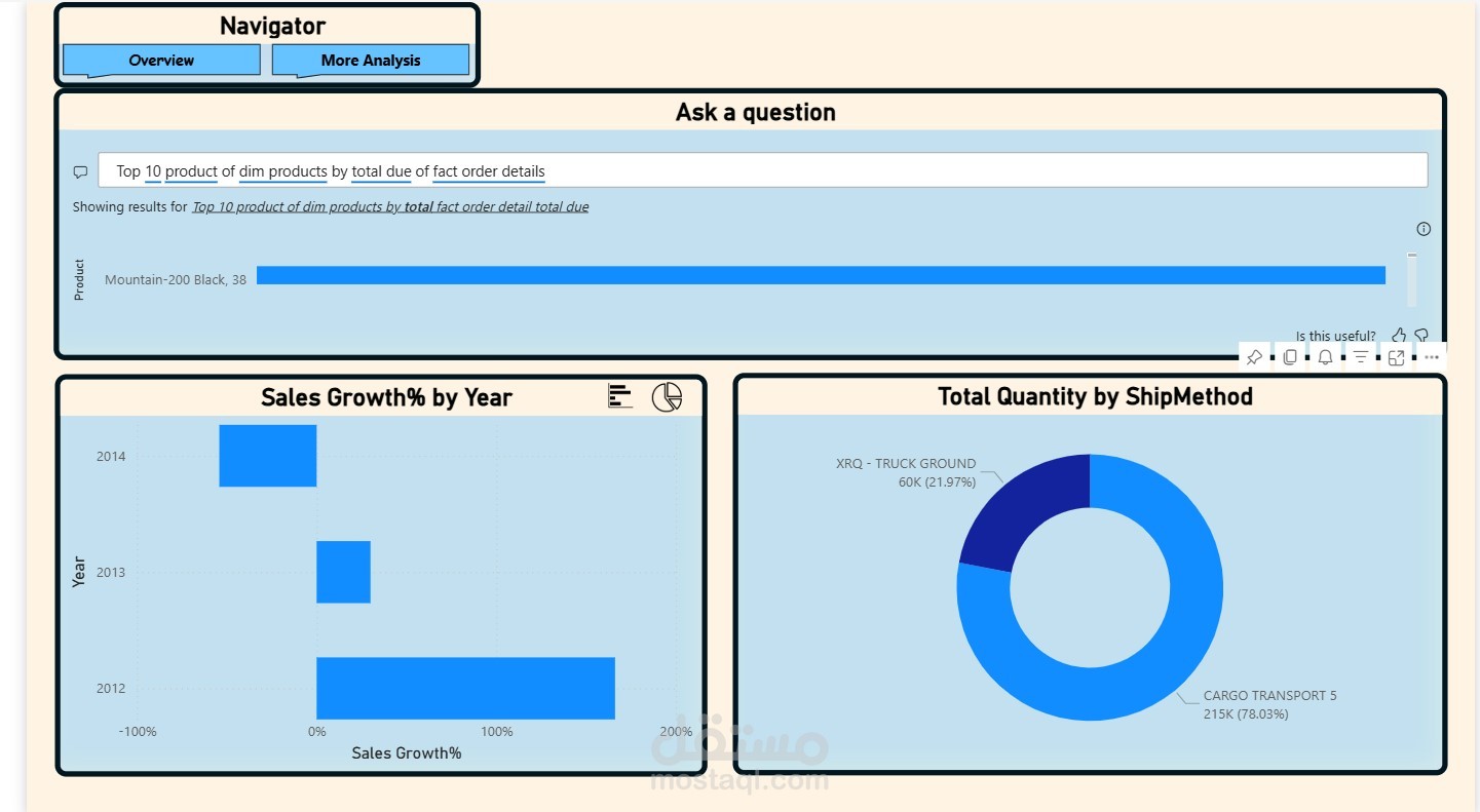 ️ تم إعداد اللوحة باستخدام Power BI مع تصميم بصري مميز (Blue Theme) ، وإضافة تنقل (Navigator) بين الصفحات لسهولة الاستكشاف وتحليل البيانات من زوايا مختلفة.