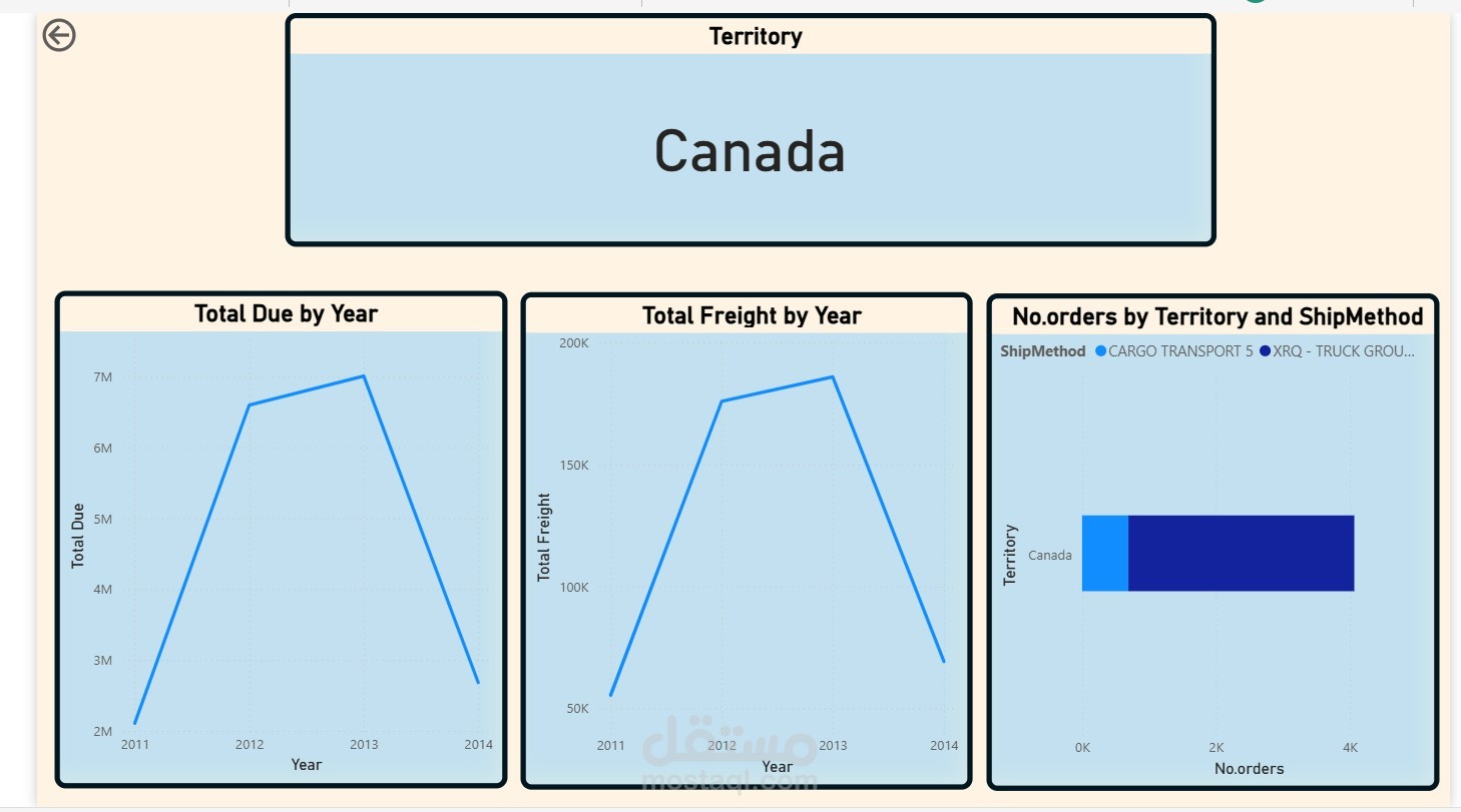 مؤشرات رئيسية (KPIs): إجمالي المستحقات (Total Due)، عدد الطلبات، إجمالي الكمية، إجمالي الضريبة، الشحن، نسبة نمو المبيعات.
