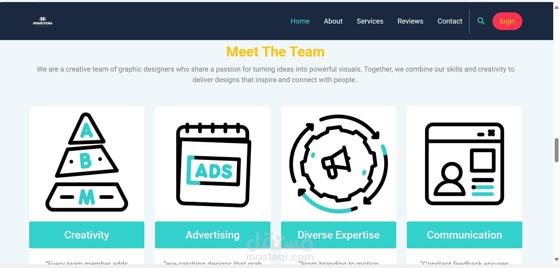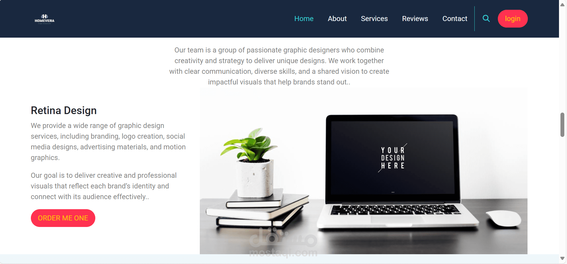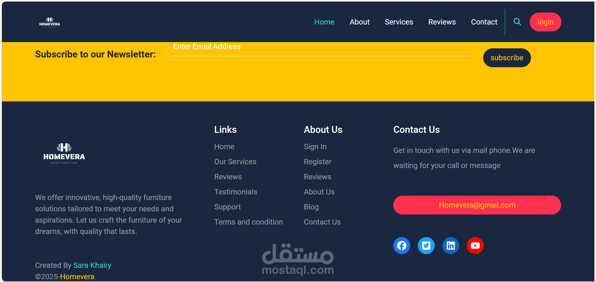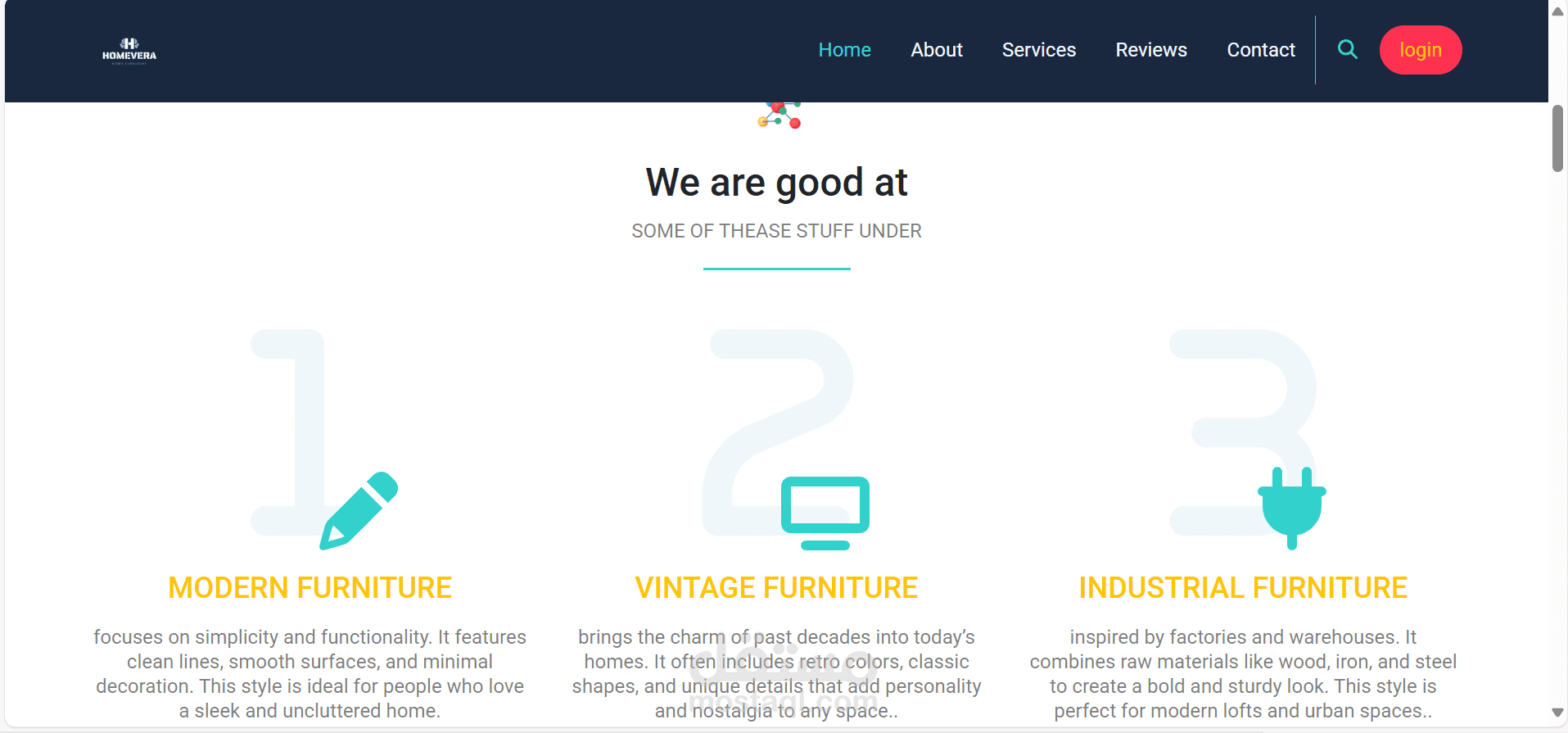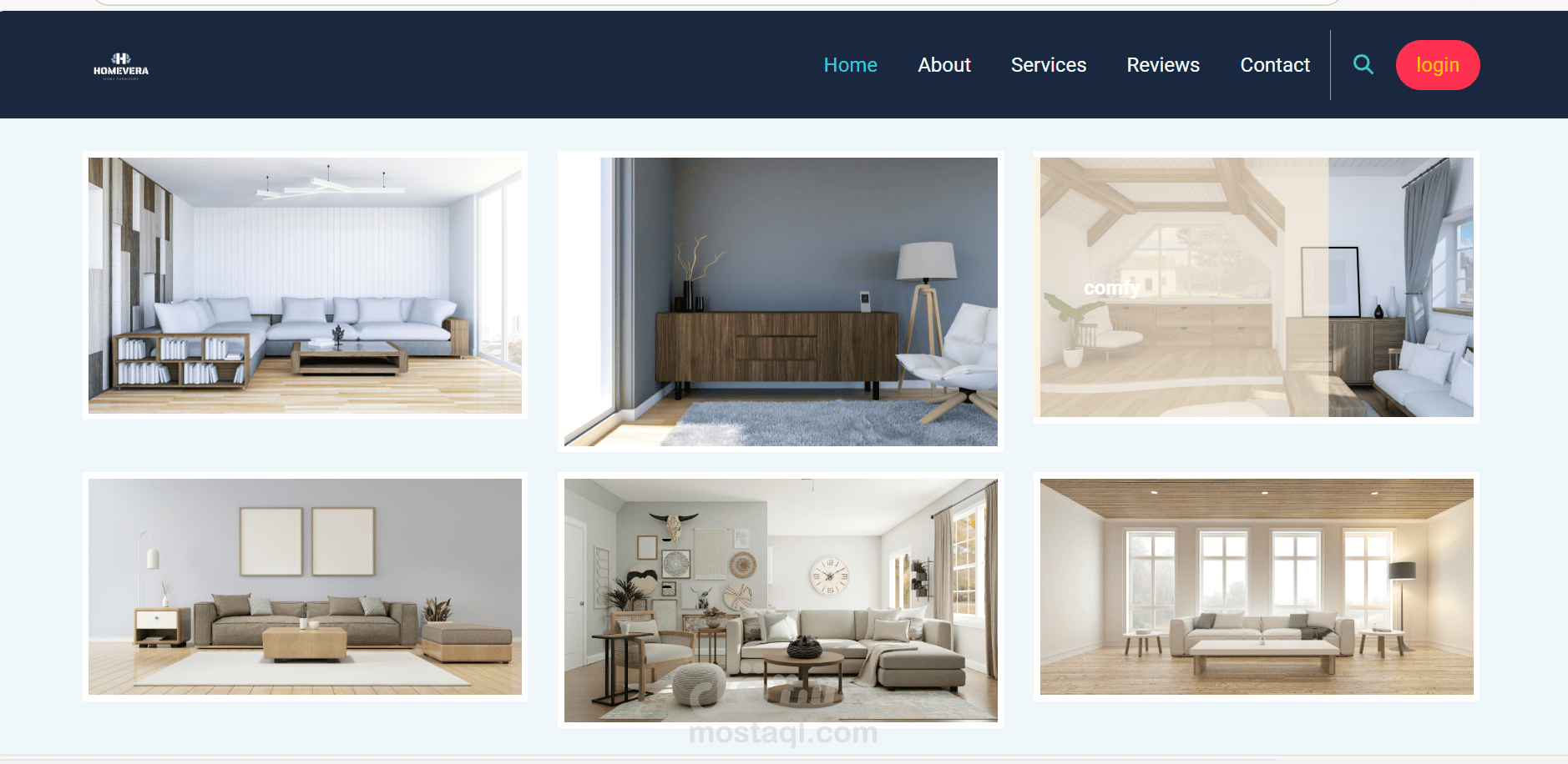 Homevera هو مشروع متخصص في تصميم وعرض منتجات الأثاث العصري والعملي، مع واجهة استخدام مميزة وسهلة التصفح. المشروع تم بناؤه باستخدام HTML, CSS, Bootstrap ليوفر تجربة سلسة على مختلف الأجهزة (كمبيوتر – تابلت – موبايل).