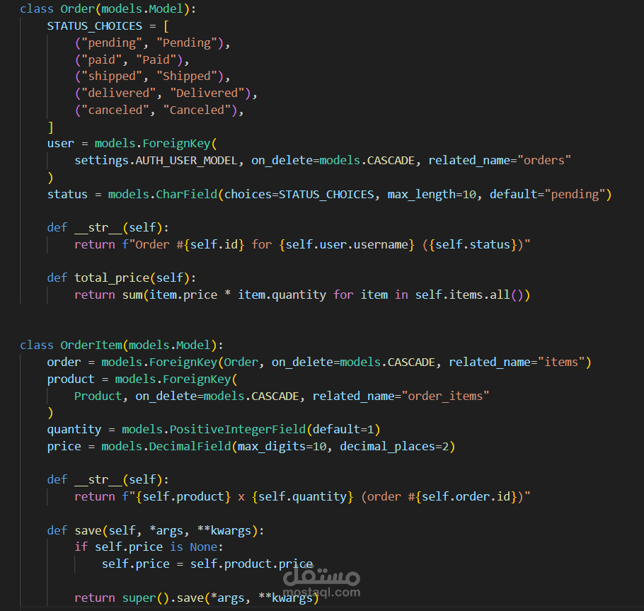 إنشاء وإدارة الطلبات (Orders) مع حالة الطلب (معلق – مكتمل – ملغي).