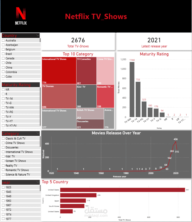 قمت بتصميم لوحة تفاعلية على Power BI لعرض وتحليل بيانات نتفلكس من أفلام ومسلسلات.
