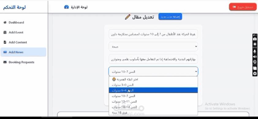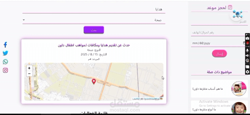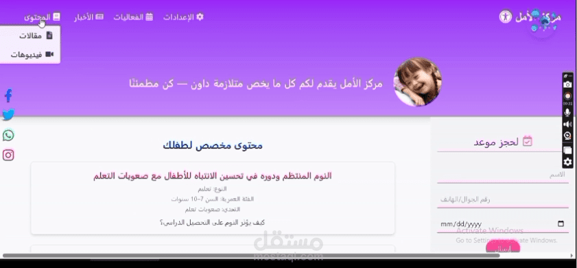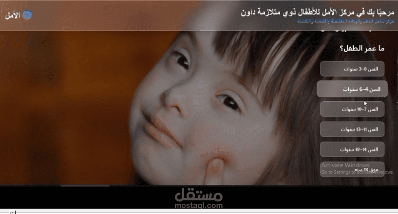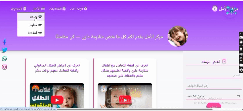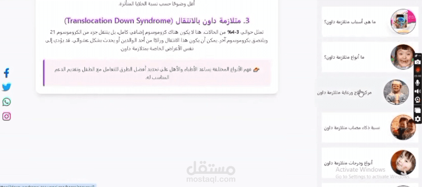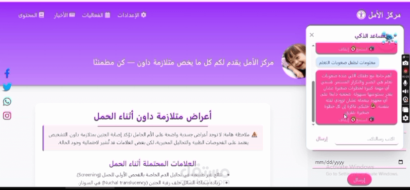 المشروع عبارة عن منصة لمركز متلازمة داون (Down Syndrome Center)، تم تصميمها لتوفير محتوى تفاعلي ومخصص لاحتياجات الأطفال وأولياء أمورهم، وتشمل المزايا التالية: