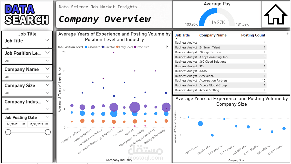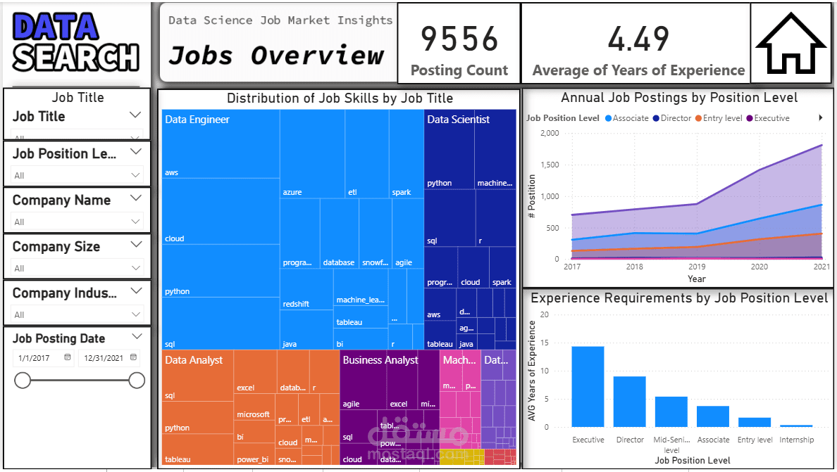 مشروع ذكاء أعمال (Business Intelligence) متكامل باستخدام Microsoft Power BI، يهدف إلى تحليل بيانات إعلانات الوظائف في مجال علوم البيانات واستخلاص رؤى استراتيجية تدعم قرارات التوظيف.