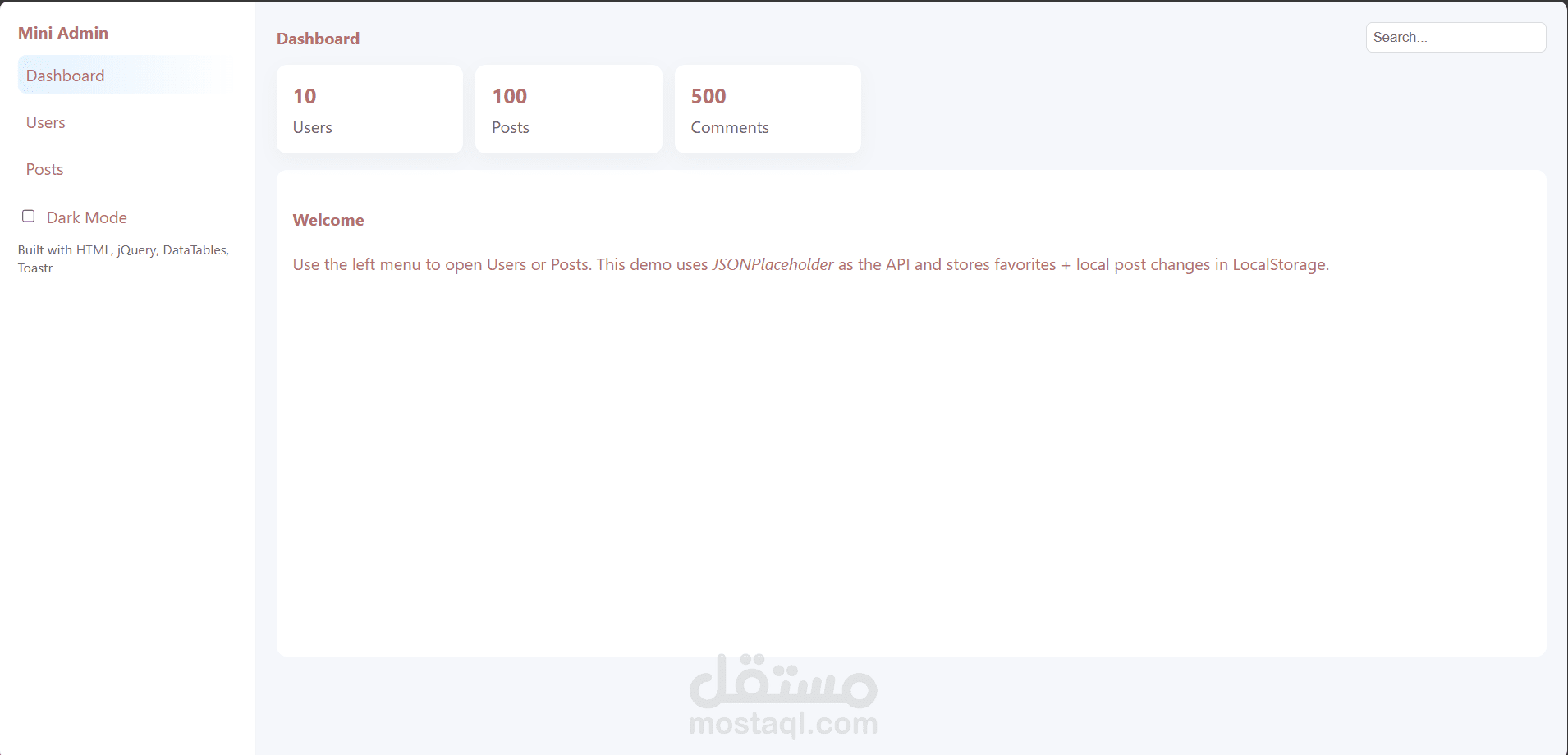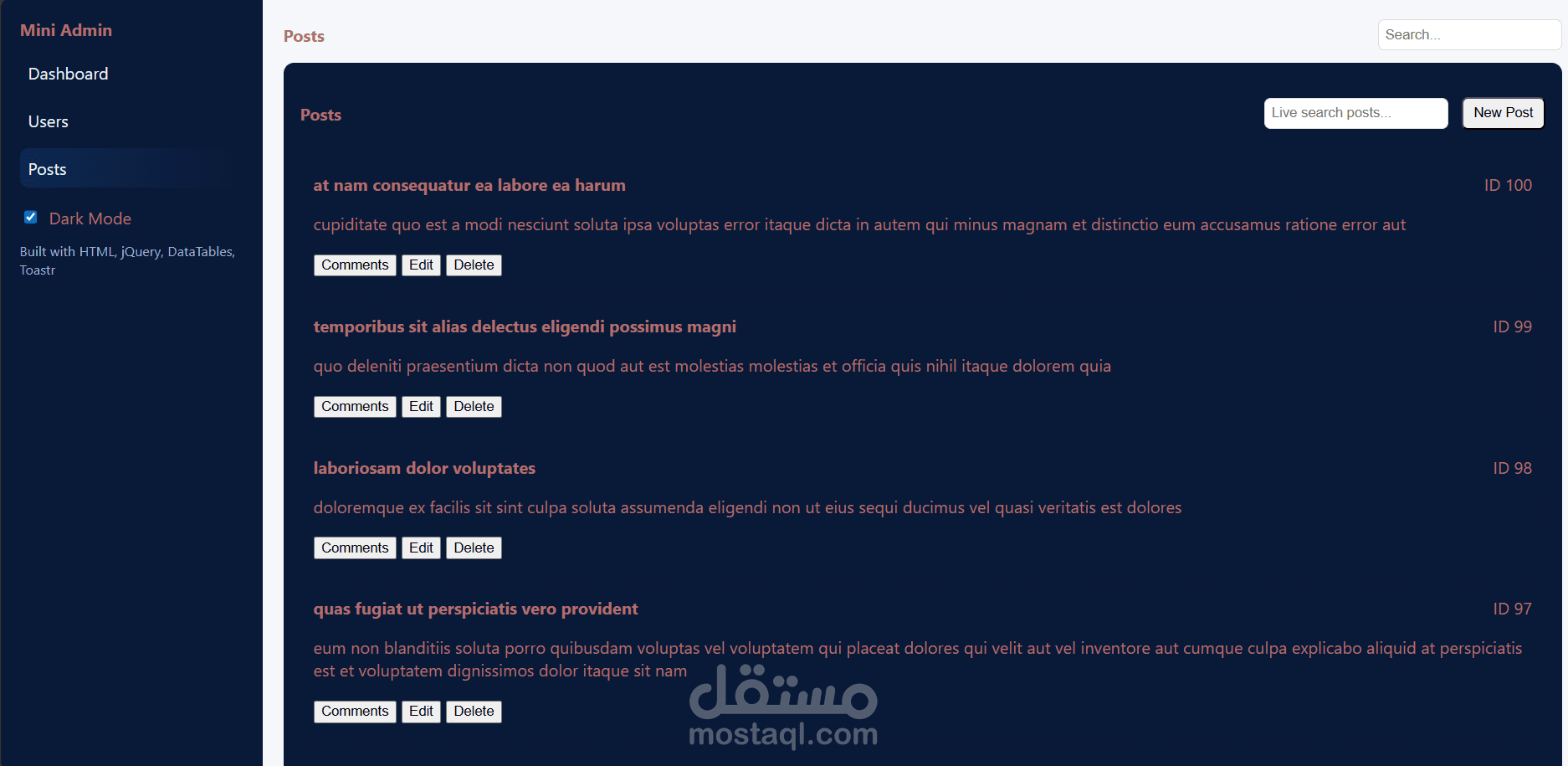 HTML, CSS, Animate.css, JS, jQuery, DataTables, JSONPlaceholder API, Toastr.