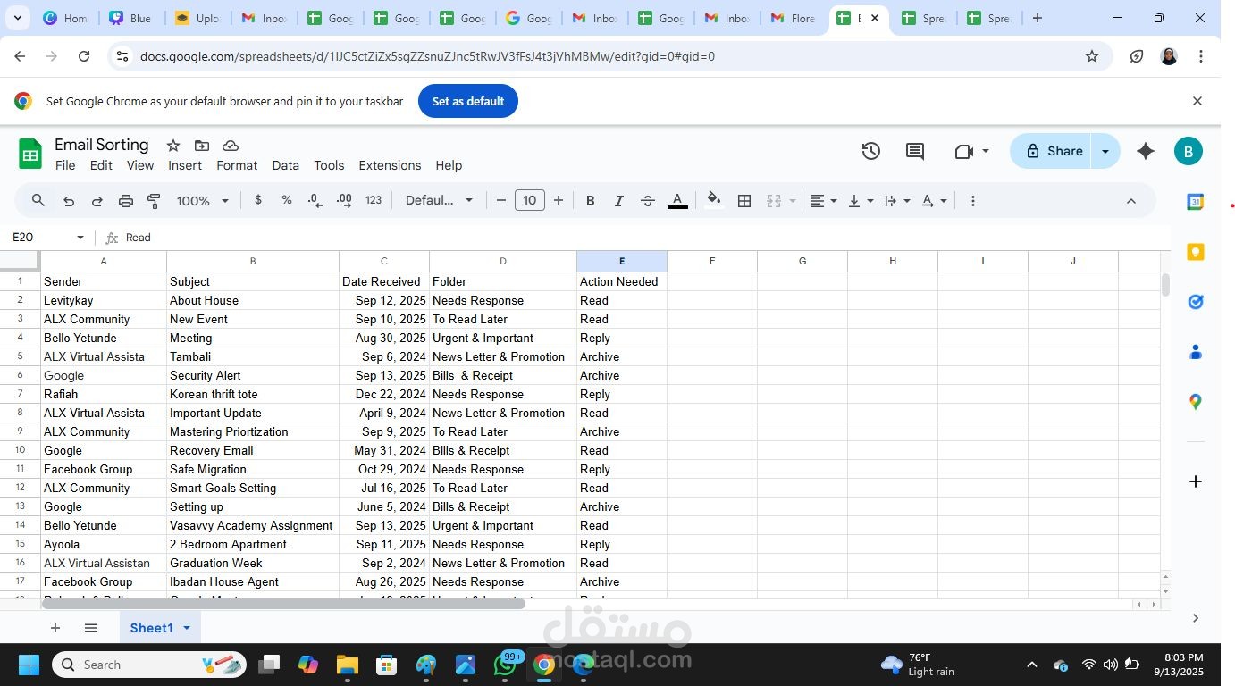 ملف Excel أو Google Sheets يحتوي على البيانات المدخلة بشكل منظم وخالي من الأخطاء.