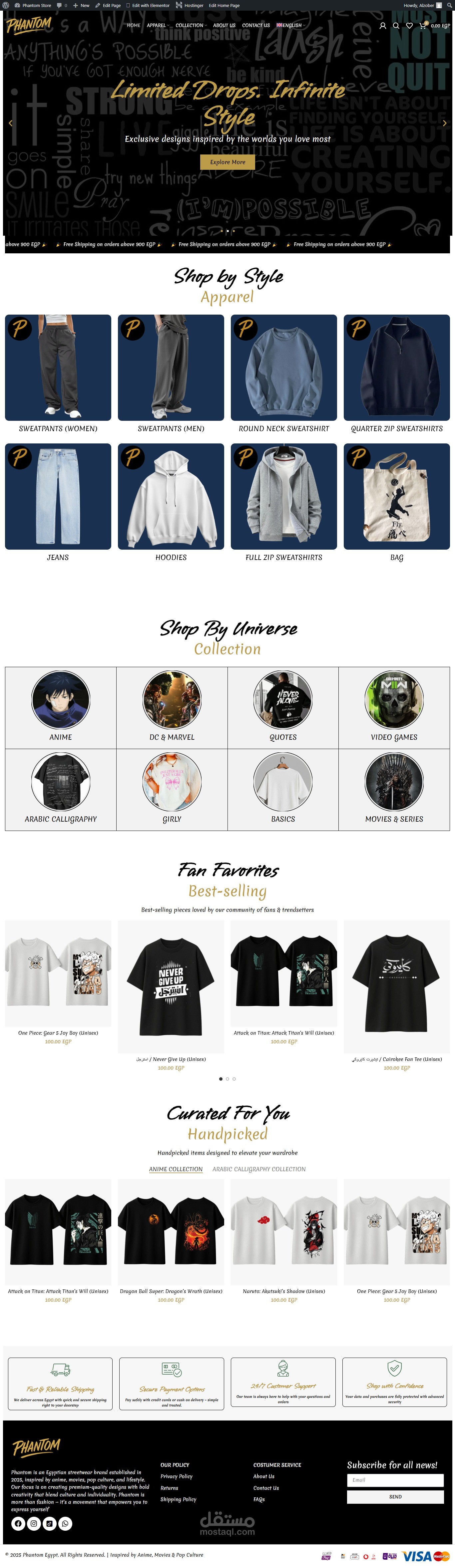 PhantomEgypt.com هو متجر إلكتروني متخصص في بيع الملابس الكاجوال والمنتجات المستوحاة من ثقافة الشارع (Streetwear)، مع تصميمات حصرية محدودة الإصدار. يضم الموقع مجموعة متنوعة من المنتجات تشمل هوديز، سويت شيرتس، جينز، حقائب وإكسسوارات، بالإضافة إلى مجموعات خاصة مستوحاة من عوالم مختلفة لإرضاء أذواق متنوعة. تم تطوير الموقع باستخدام ووردبريس ليجمع بين تجربة تصفح سلسة وتصميم عصري يتناسب مع هوية العلامة التجارية. يتميز بواجهة سهلة الاستخدام، نظام دفع وشحن آمن، واستجابة كاملة مع جميع الأجهزة، مما يمنح العملاء تجربة تسوق أونلاين عملية وممتعة.