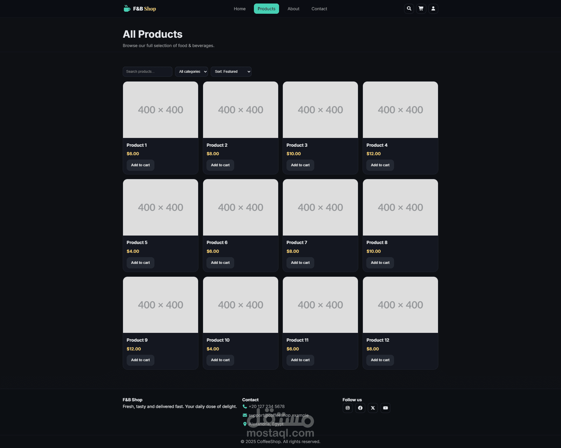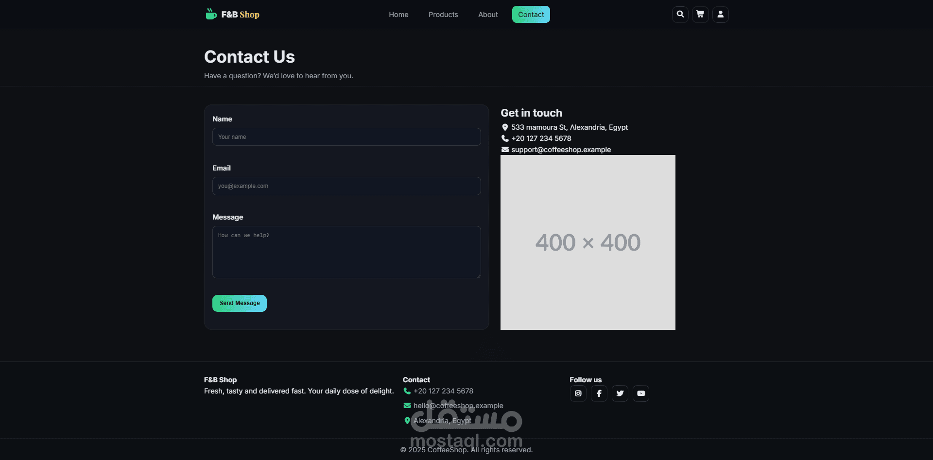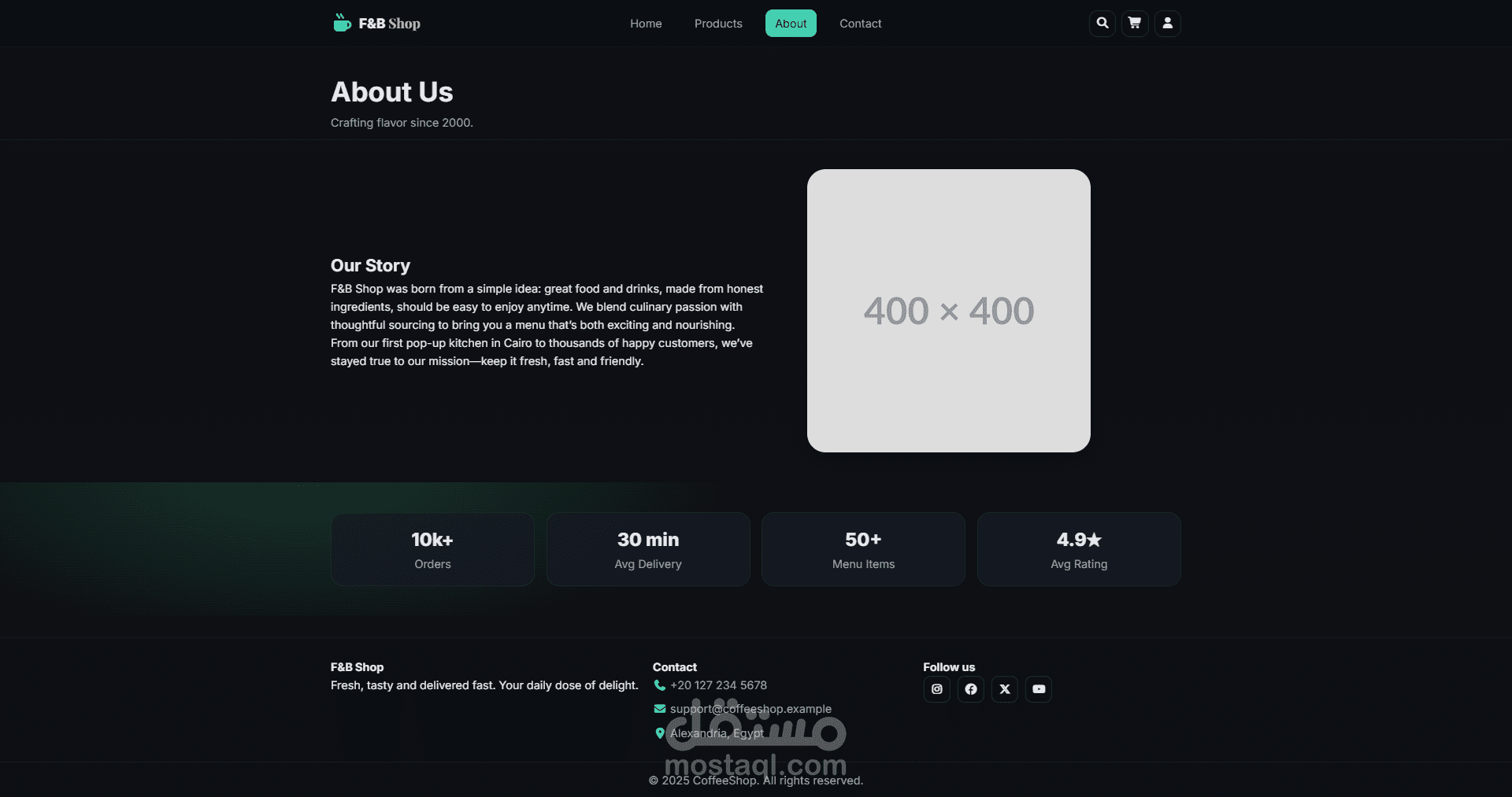 متجر إلكتروني مخصص لبيع منتجات الطعام والمشروبات. تم تطويره باستخدام HTML, CSS, Bootstrap وReact.js مع تصميم متجاوب بالكامل. المتجر يتيح استعراض المنتجات، إضافة عناصر إلى السلة، إتمام عملية الدفع، والوصول لصفحة نجاح الطلب. ركزت في هذا المشروع على بناء تجربة تسوق سهلة وسريعة مع واجهة منظمة واحترافية.