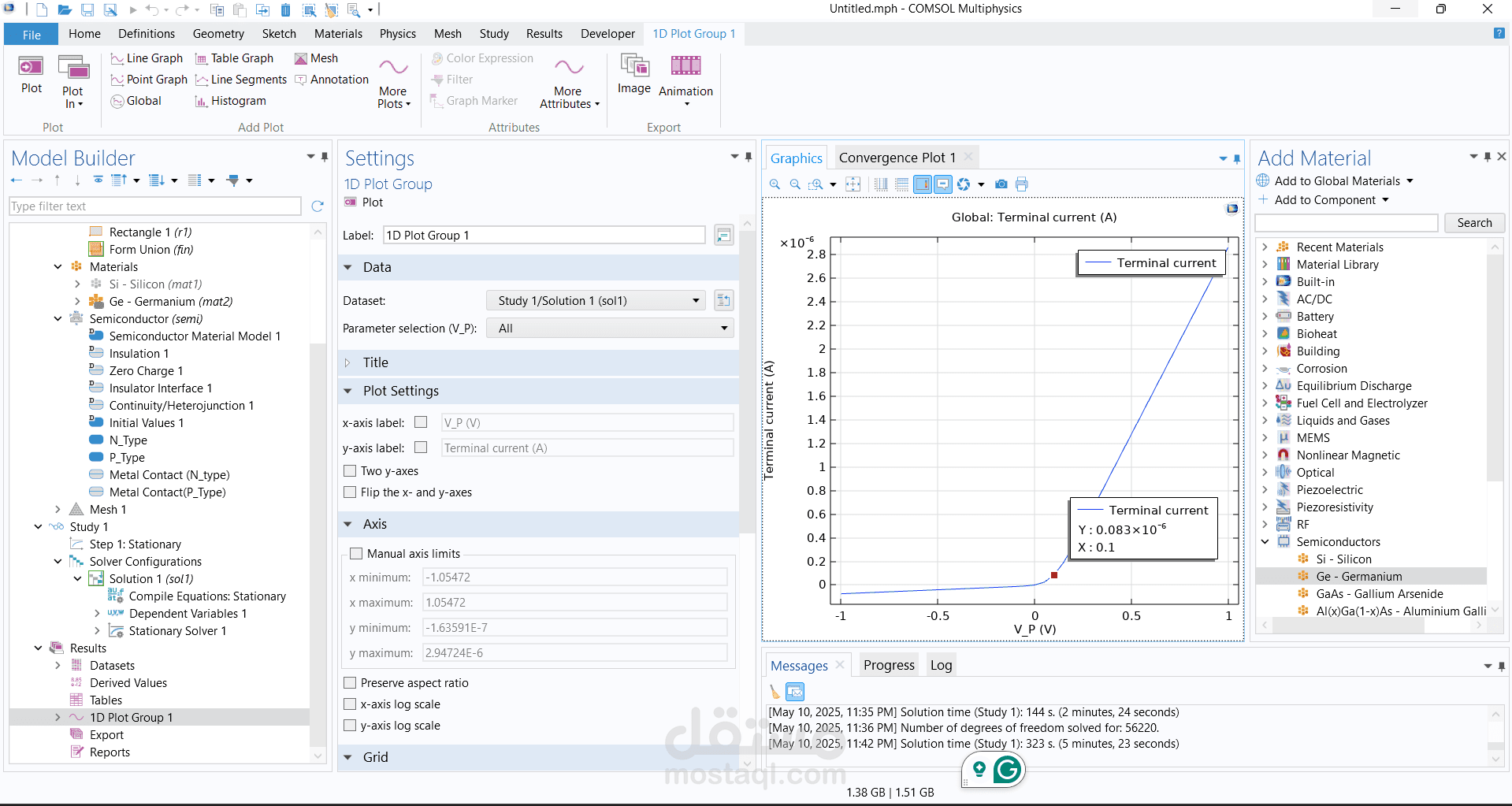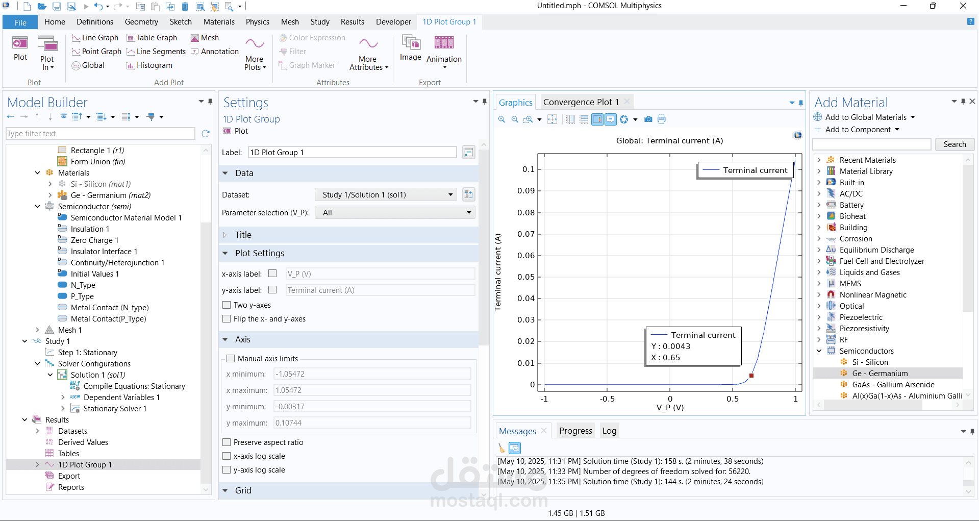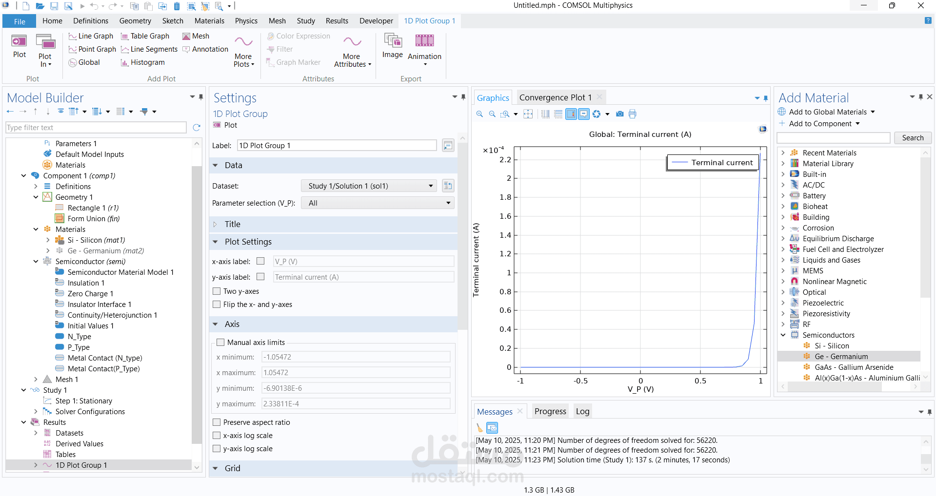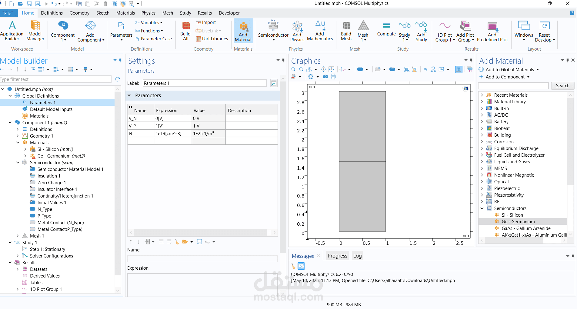 تصميم وبناء وصلة ثنائية الأبعاد (2D P-N Junction) باستخدام برنامج COMSOL Multiphysics.