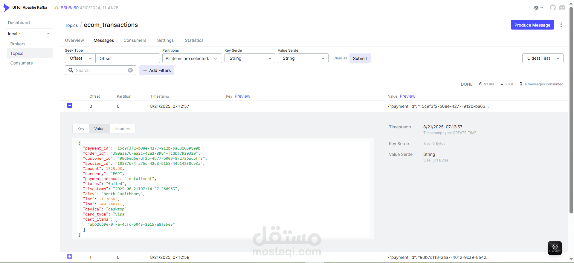 بيانات آنية (Streaming) يتم توليدها باستخدام Python Faker وإرسالها عبر Apache Kafka.
