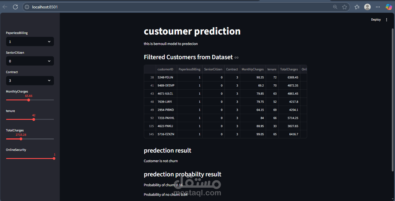 التطبيق مبني على Bernoulli Model للتصنيف، وبيساعد في معرفة احتمالية إن العميل يسيب الشركة أو يفضل موجود.