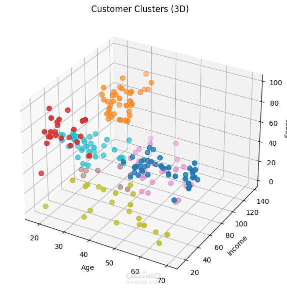 تصور البيانات: تم إنشاء مخططات تشتت (Scatter Plots)، بما في ذلك مخطط ثلاثي الأبعاد، لتصور المجموعات الناتجة وتوزيع العملاء فيها بشكل واضح.