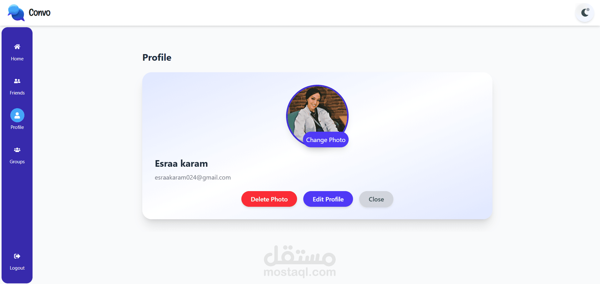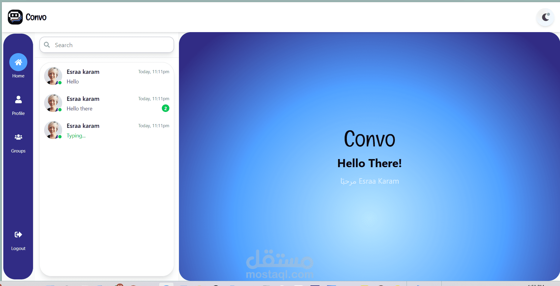 Convo هو تطبيق دردشة فوري (real-time) متكامل (Full-Stack)، تم تطويره باستخدام React في الواجهة الأمامية، و Node.js / Express في الواجهة الخلفية، مع استخدام MongoDB لتخزين البيانات، و Socket.IO لتوفير المحادثات المباشرة.