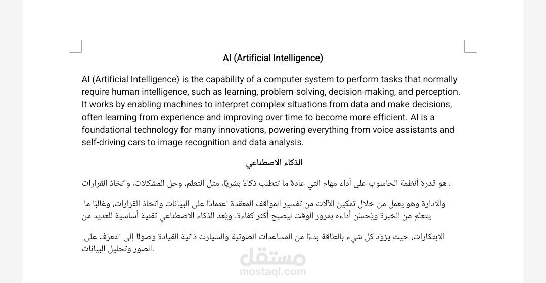 قمتُ بترجمة نص تقني تعريفي عن الذكاء الاصطناعي (Artificial Intelligence) AI من اللغة الإنجليزية إلى اللغة العربية. ركّزت في الترجمة على: