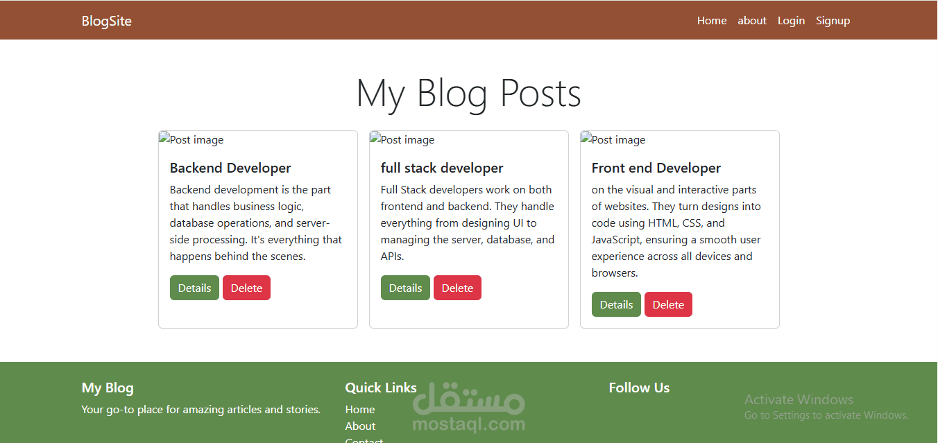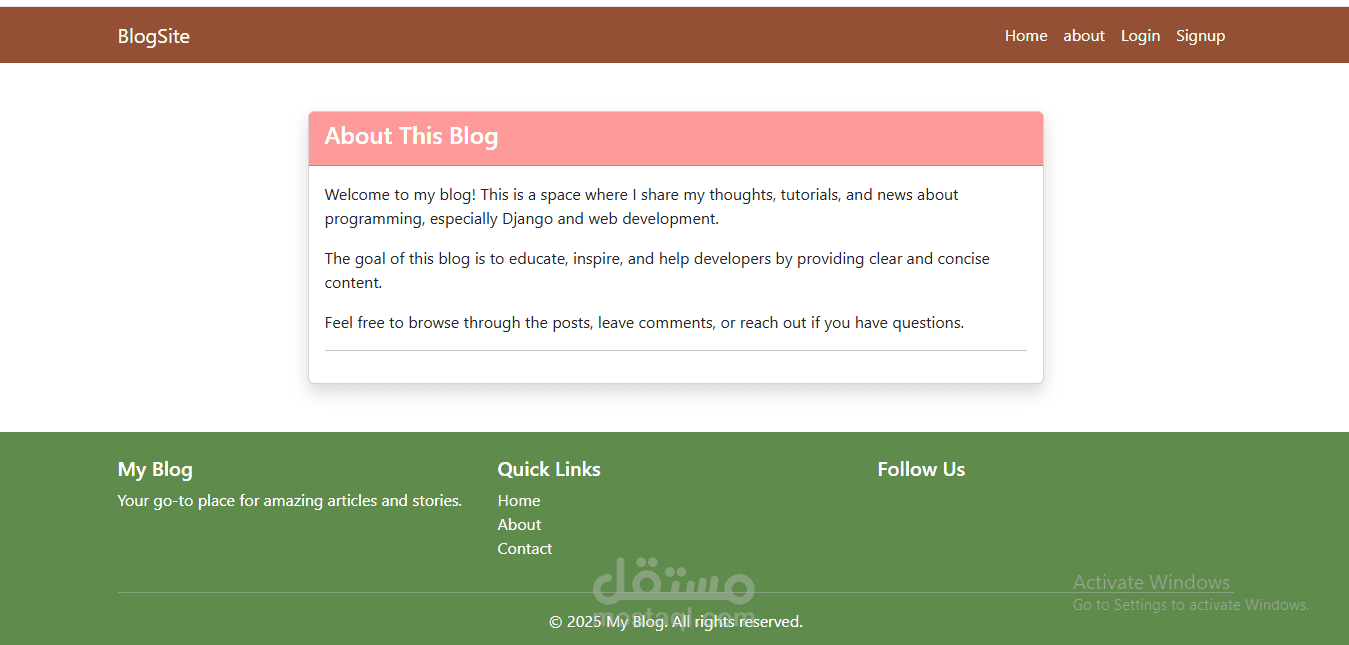 "موقع Blog احترافي مصمم لعرض المقالات والمحتوى النصي بطريقة منظمة وسهلة الاستخدام، مع واجهة مستخدم جذابة وتصميم متجاوب يتوافق مع جميع الأجهزة (كمبيوتر، تابلت، هاتف). يسمح الموقع للزوار بتصفح المقالات حسب الأقسام أو الوسوم، ويدعم خاصية البحث داخل المحتوى.
