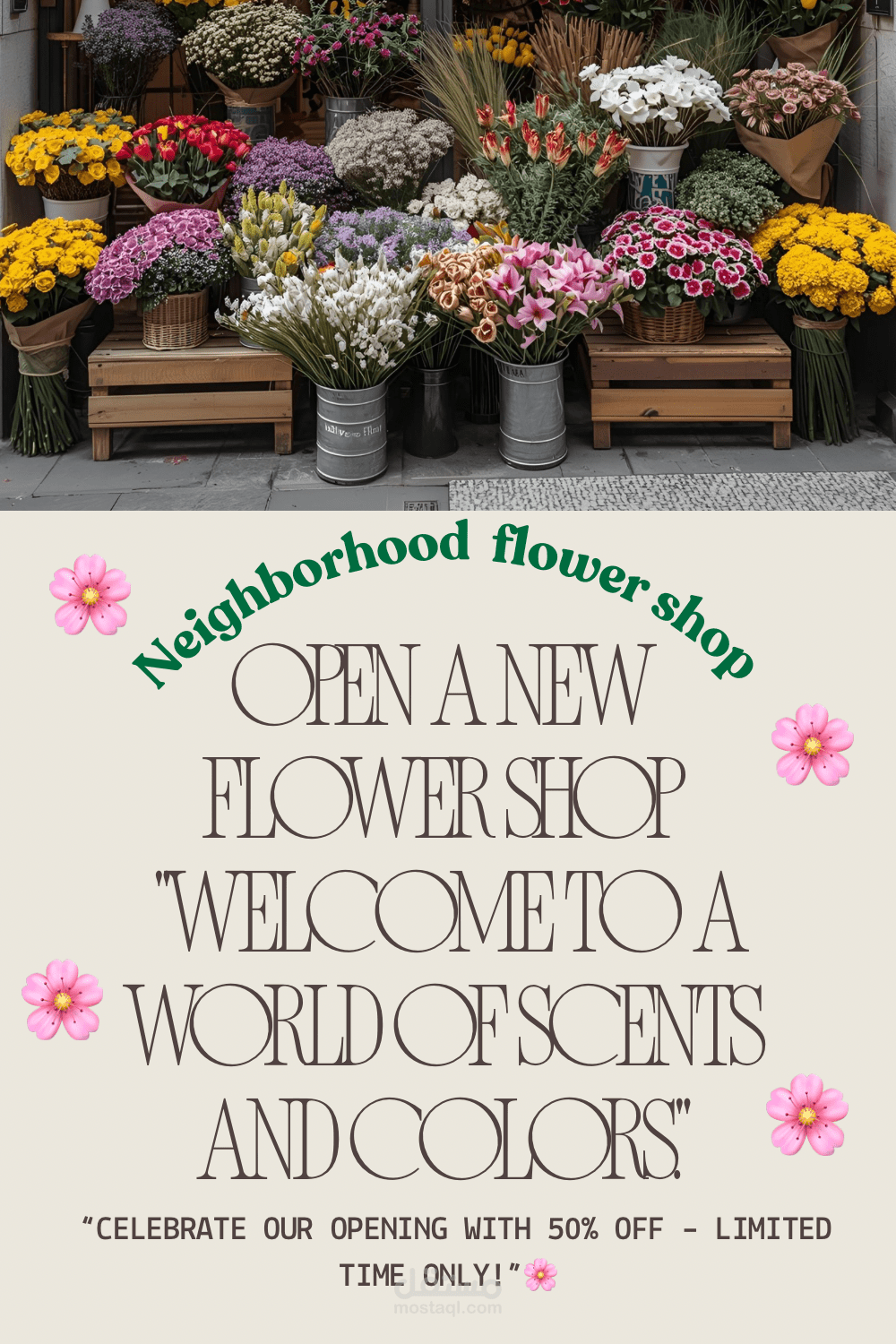 إعلان عن افتتاح محل ورد في الحي الفئة الموجهه عن سكان الحي بإستخدام برنامج Canva