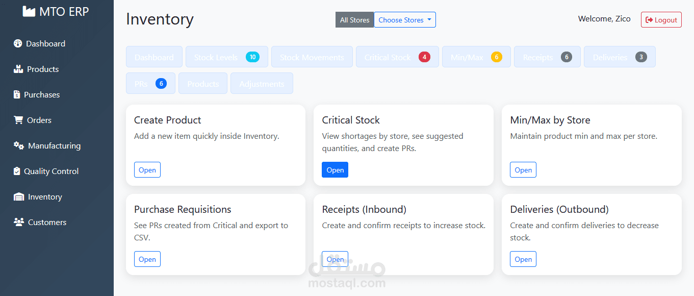 النظام يشمل: إدارة المخزون، أوامر المبيعات، أوامر الإنتاج، الجودة اليومية، واستلام وتسليم المخزن.
