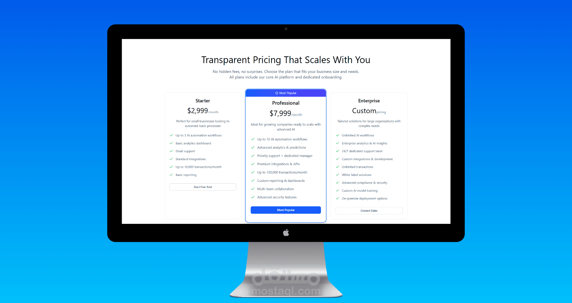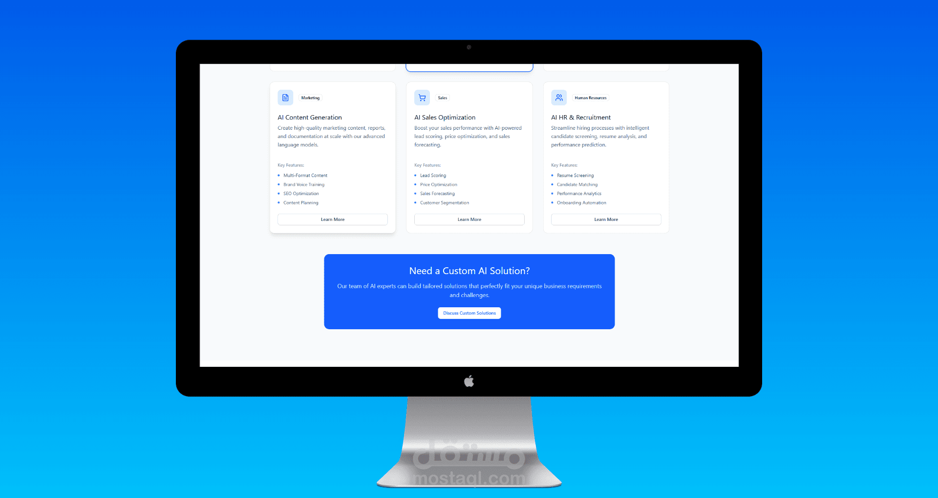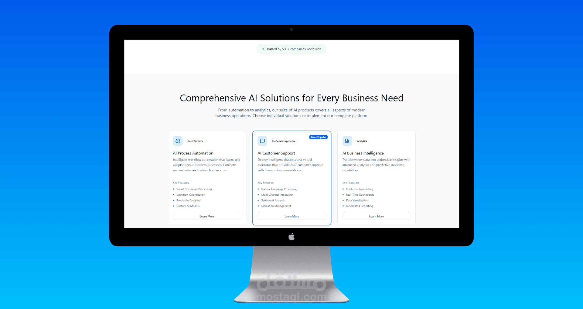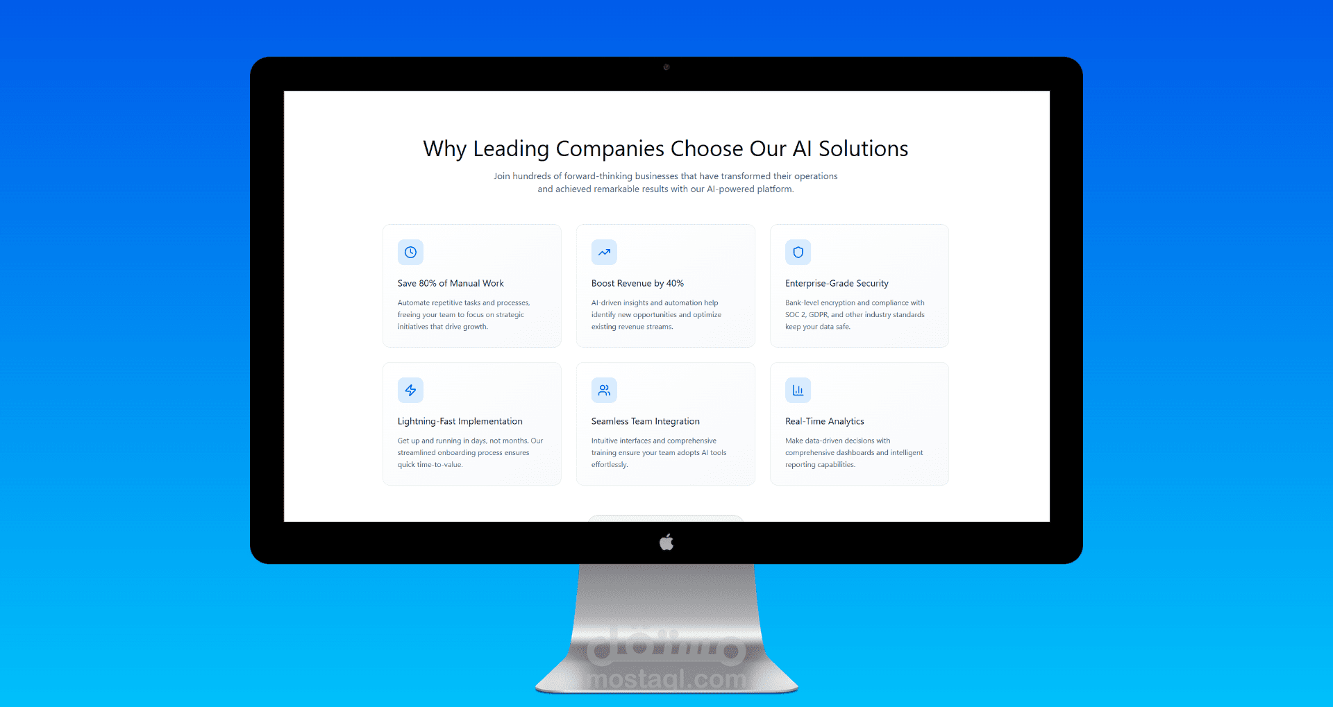 مصمم في Figma، هذا المفهوم لصفحة هبوط من صفحة واحدة يسلّط الضوء على عملك في مجال الذكاء الاصطناعي بتصميم أنيق ومتجاوب يبدو رائعًا على كلٍ من سطح المكتب والجوال. استمتع بخطوط نظيفة، ورسوم وأيقونات مخصصة، ونصوص مُعدّة بعناية لتوصيل قيمة منتجك بسهولة. يوجّه التدفق المبسّط الزوار من العنوان الرئيسي وصولًا إلى الدعوة لاتخاذ الإجراء، مما يعزز التفاعل والتحويلات. يتم تسليم التصميم كـ نموذج عالي الدقة على Figma مع أصول جاهزة للتصدير لضمان تسليم سلس إلى المطوّرين.