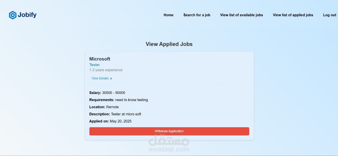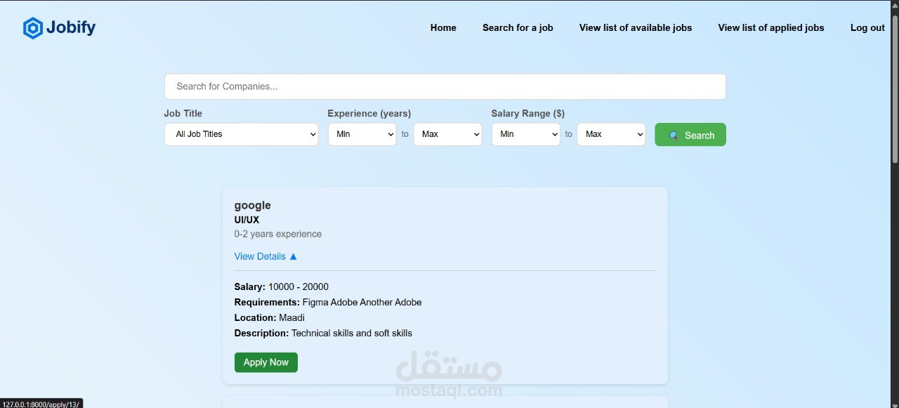 تم تطوير تطبيق ويب لإدارة الوظائف باستخدام Django، حيث يمكن للمسؤولين إنشاء الوظائف وتحريرها وحذفها، بينما يتمكّن المستخدمون من تصفح القوائم. تم تنفيذ عمليات CRUD كاملة مع تخزين دائم في قاعدة البيانات لضمان اتساق البيانات بين واجهات المسؤول والمستخدم. كما تم تحسين تجربة المستخدم عبر تنبيهات تفاعلية (Swal) وتنقل سلس، مع إعادة توجيه المسؤولين لعرض الوظائف المحدّثة بعد التعديلات. النتيجة كانت نظامًا قويًا وقابلًا للتوسع لإدارة إعلانات الوظائف بكفاءة.