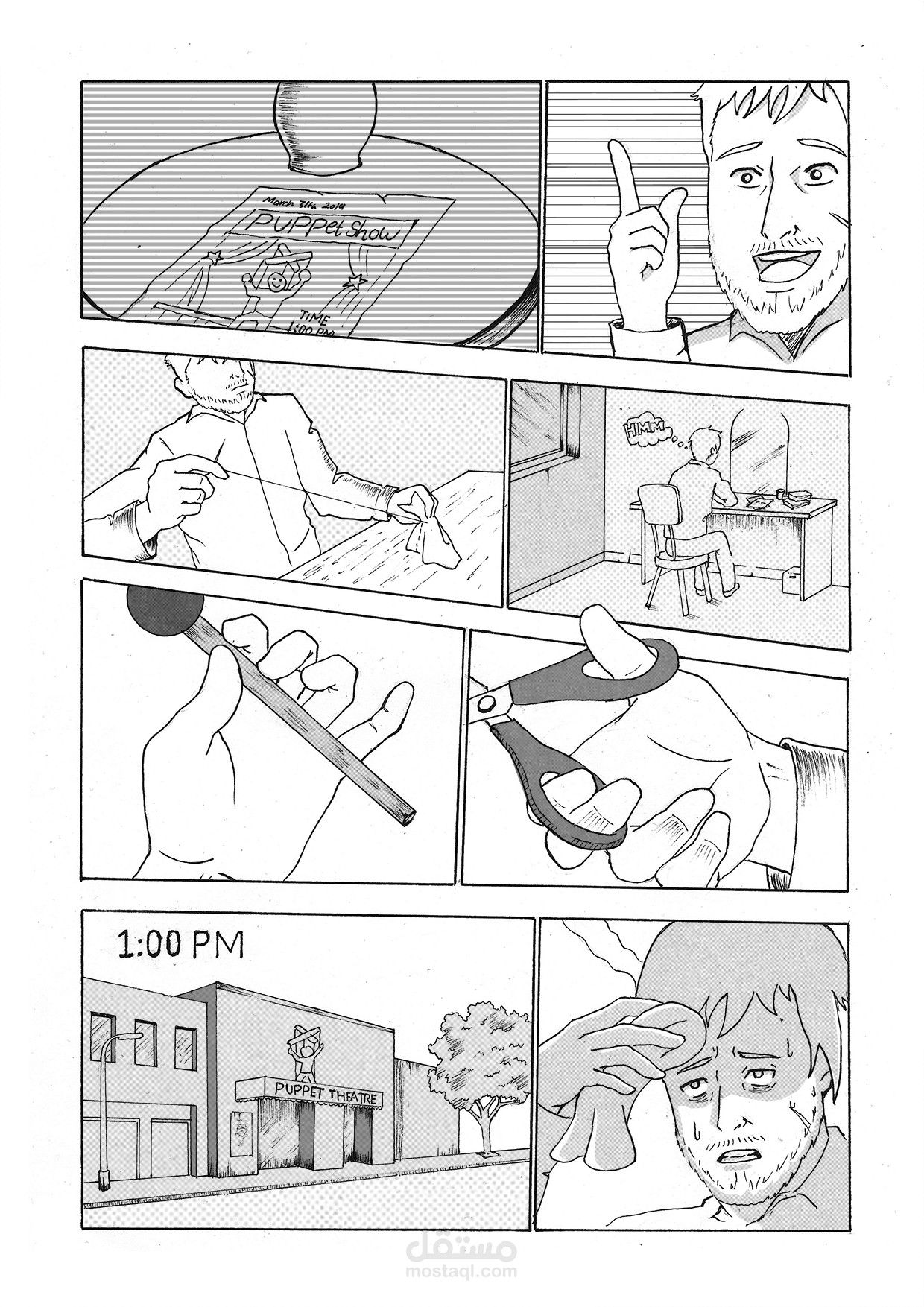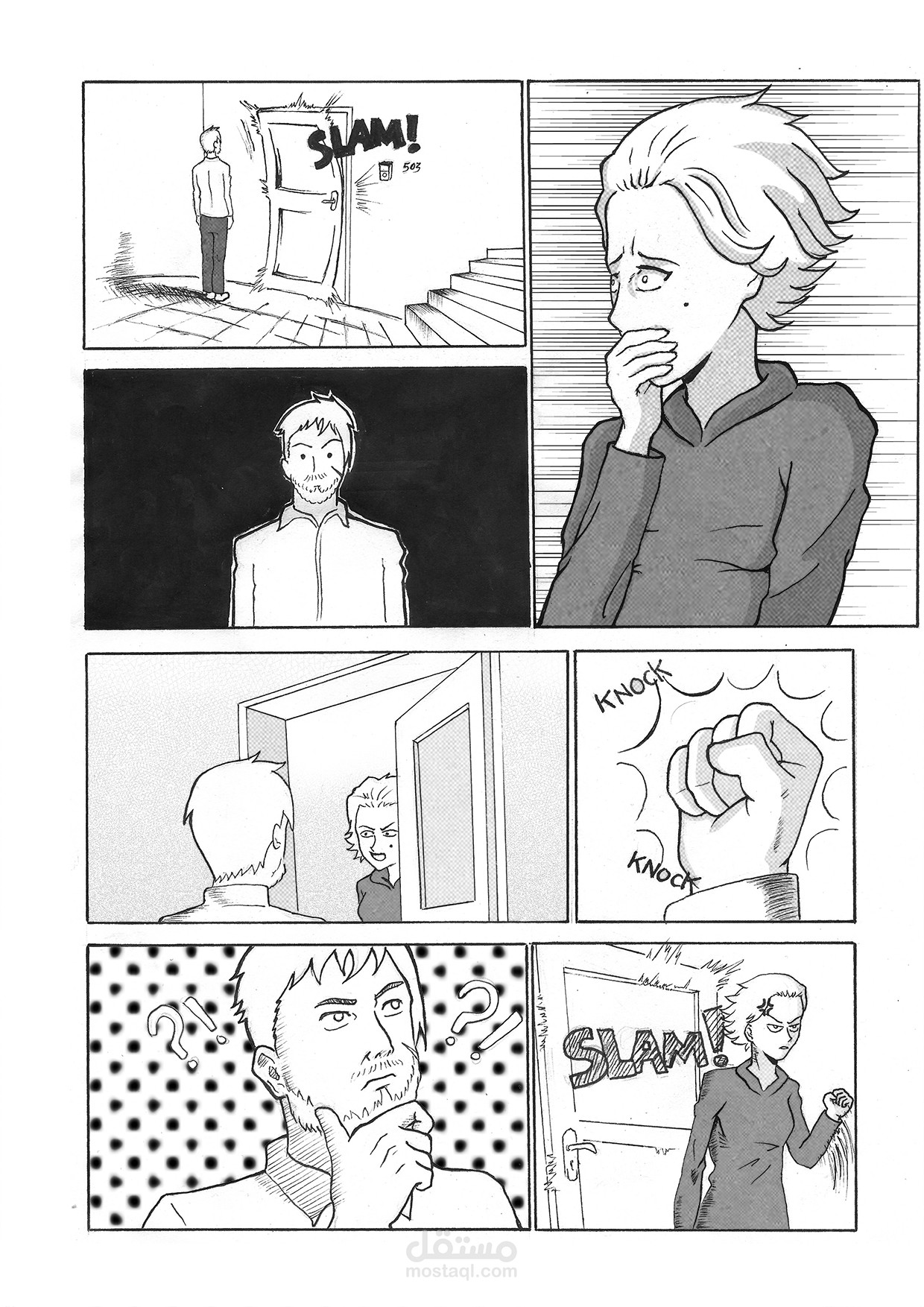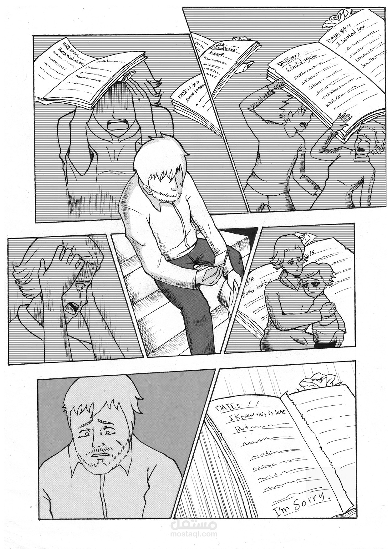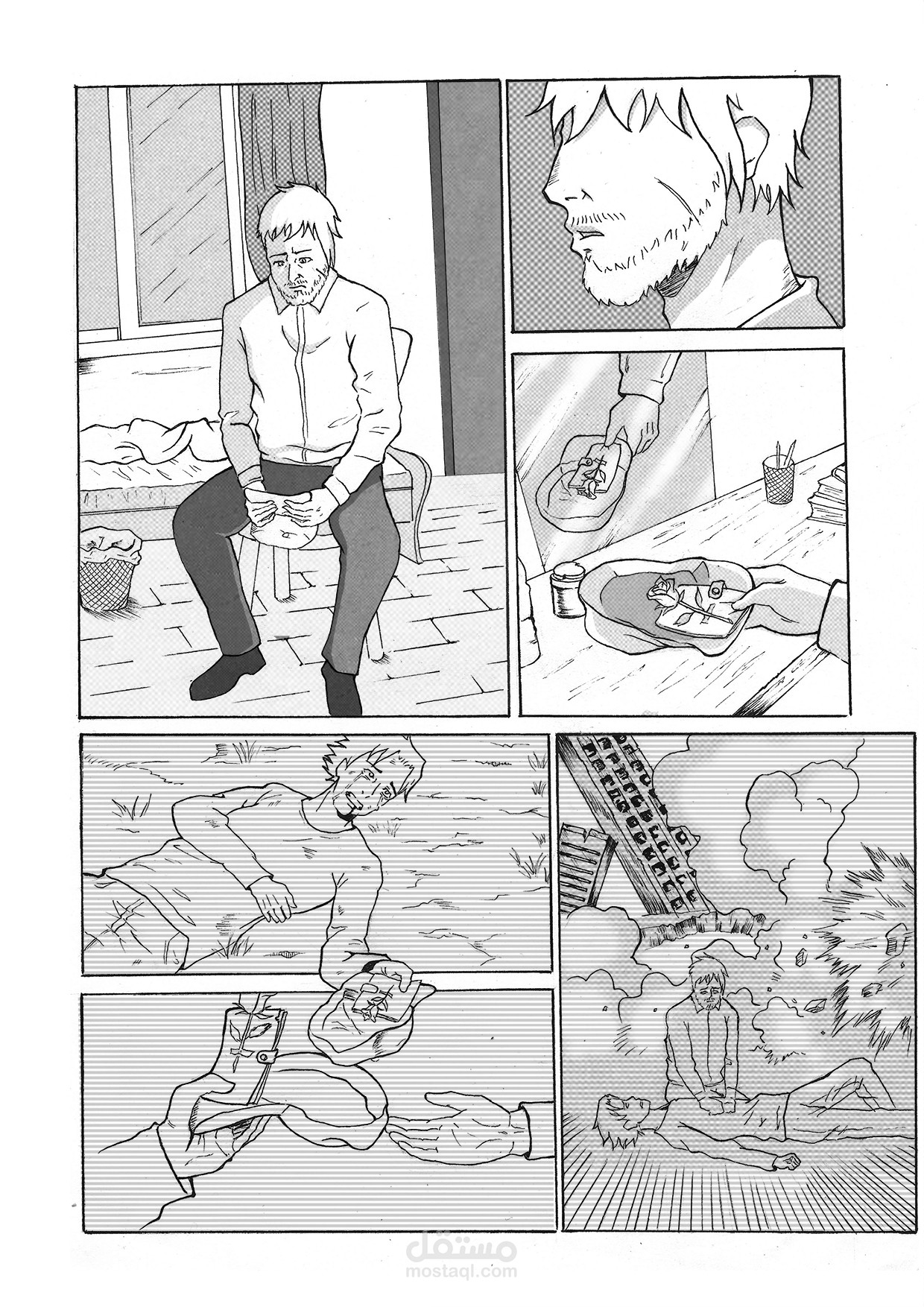 بعض الصفحات من قصة مصورة بإسلوب المانجا اليابانية وهي قصة صامتة لا تحتوي على حوارات