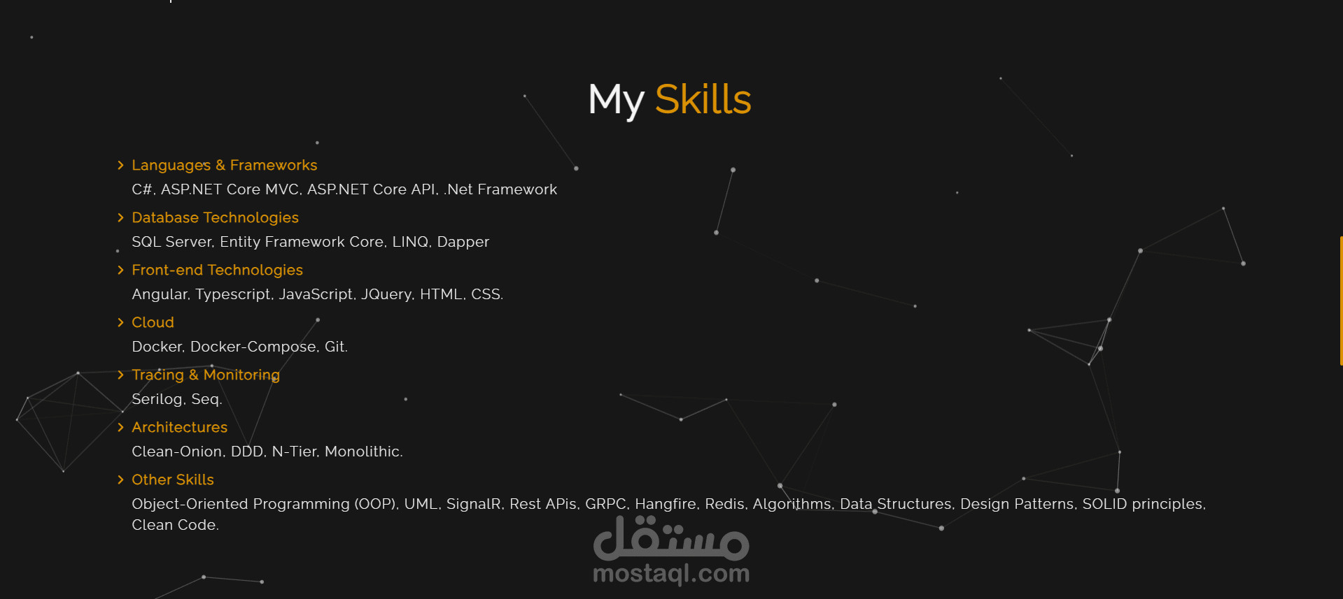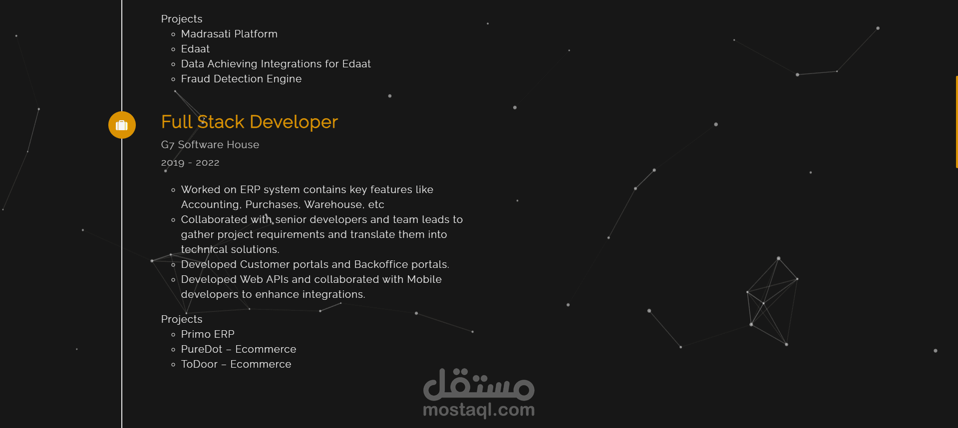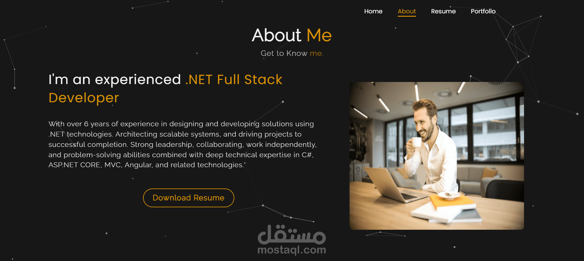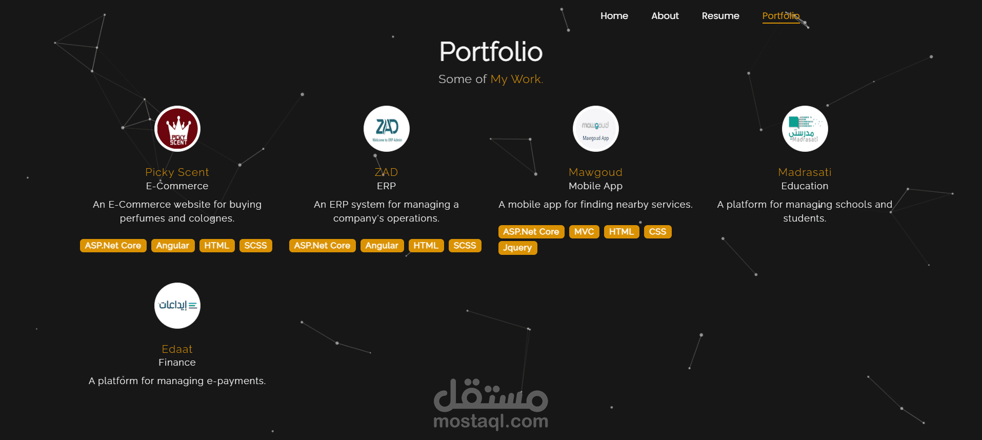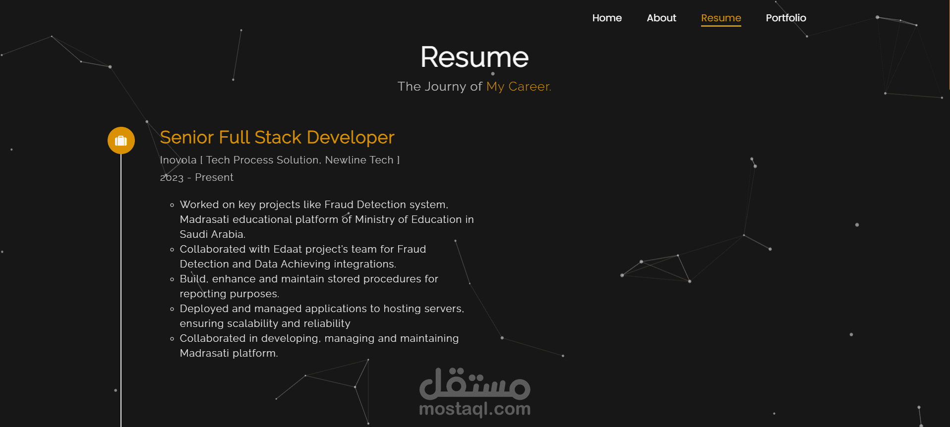 موقع بورتفوليو شخصي تم تصميمه وتطويره لعرض الأعمال والخبرات بطريقة احترافية. الموقع يتميز بواجهة عصرية وبسيطة تسهّل على الزائر استكشاف المشاريع والخدمات، مع تجربة مستخدم سلسة ومتجاوبة مع جميع الأجهزة. يهدف الموقع إلى إبراز الهوية المهنية بشكل جذاب ومرتب، مع التركيز على إبراز المهارات والإنجازات في مجال البرمجة و تطوير المواقع