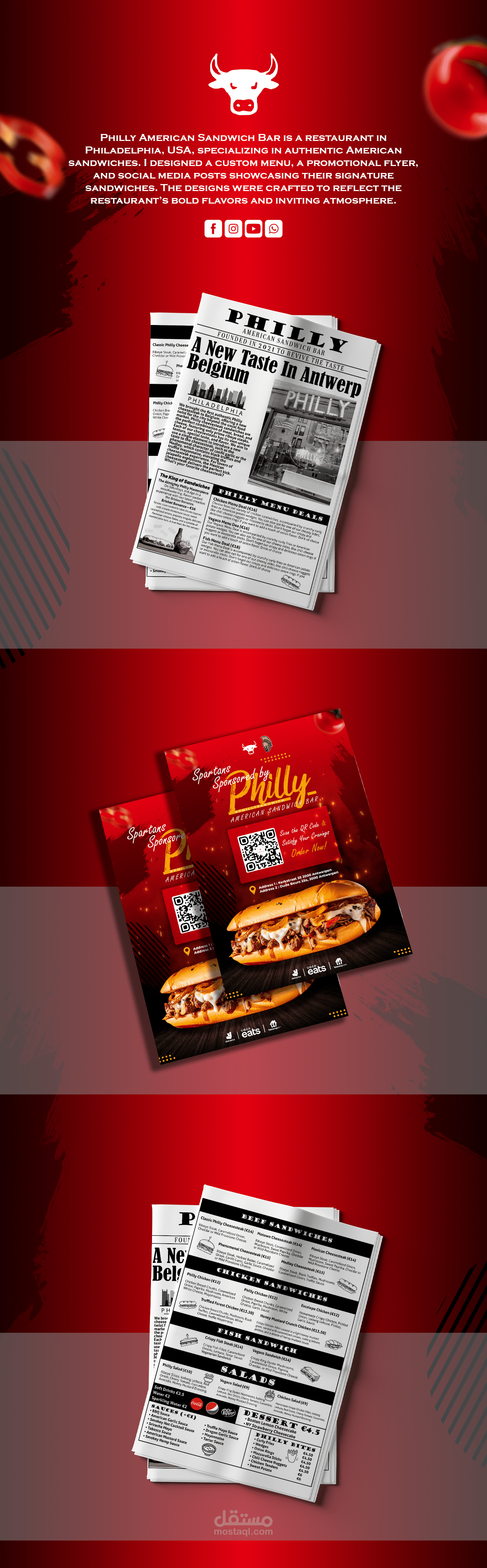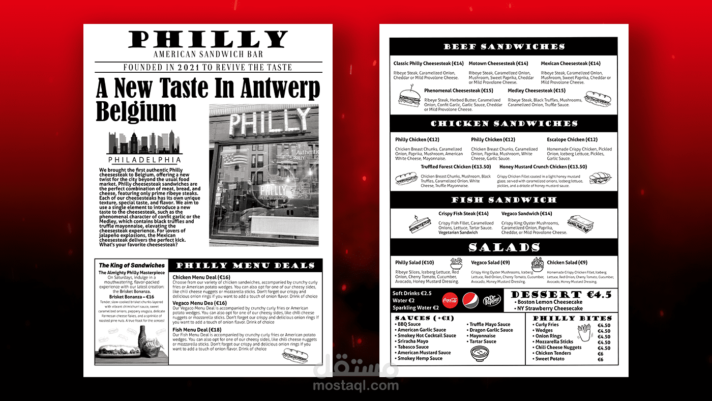 صُممت الهوية البصرية لمشروع Philly لتعكس روحًا شبابية، معاصرة، وطموحة في مجال الطعام / المطاعم. تم العمل على بناء هوية قوية وواضحة من البداية، بحيث تكون قابلة للتطبيق على جميع نقاط التفاعل مع العملاء.