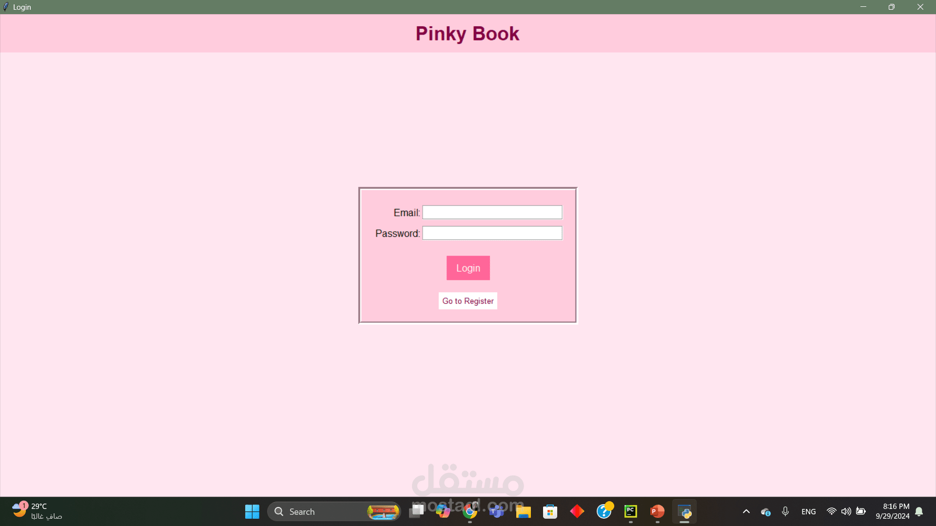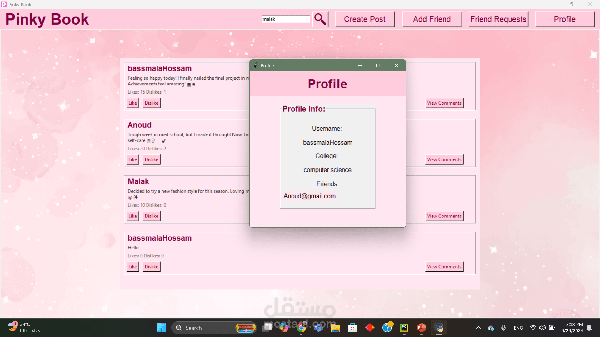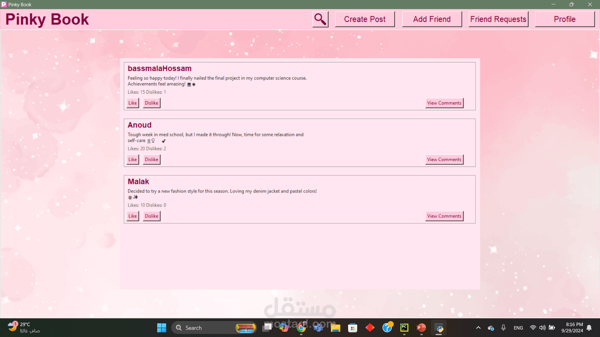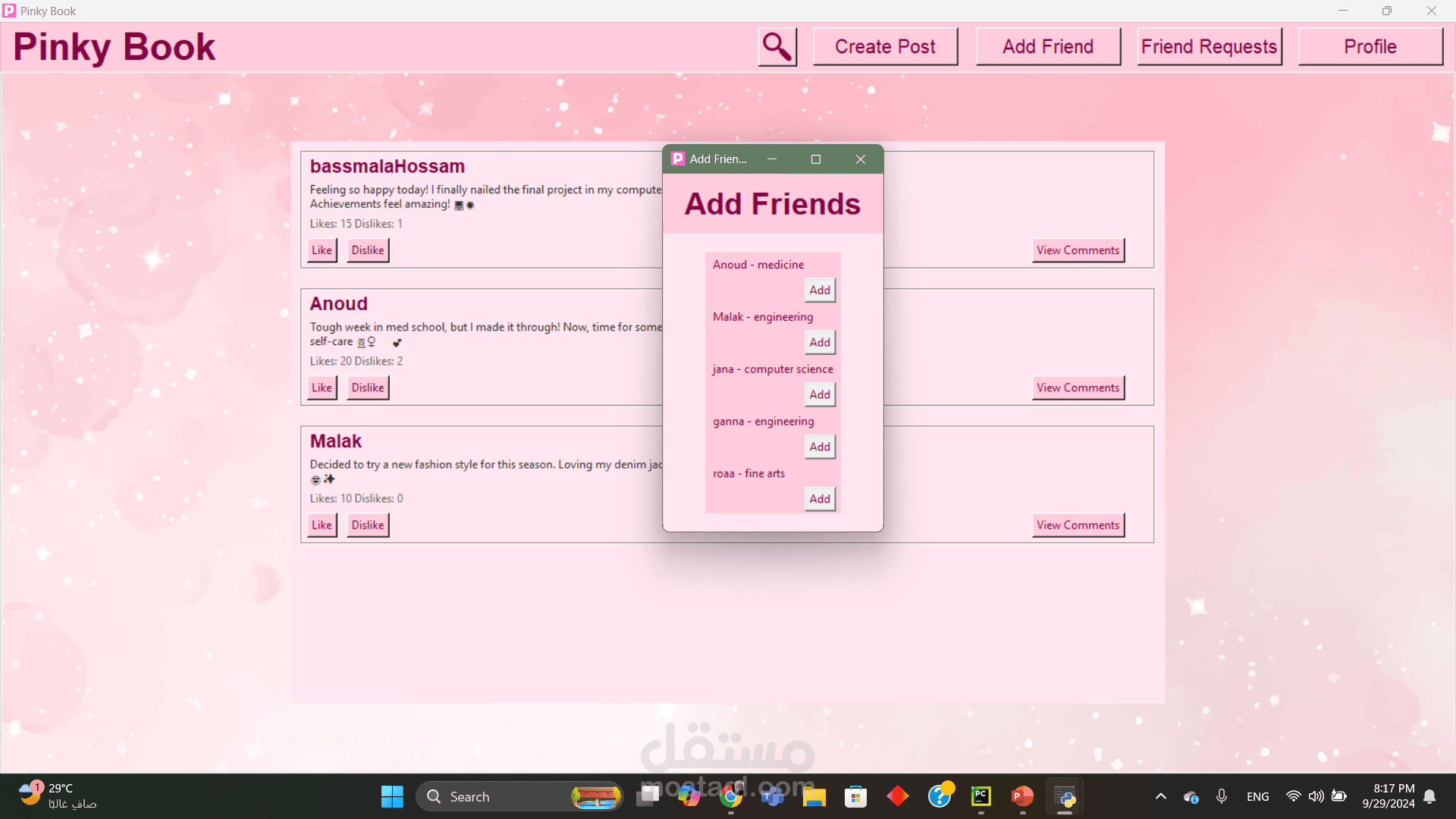 PinkyBook هو تطبيق اجتماعي تم تطويره بلغة Python باستخدام مكتبة Tkinter لتصميم الواجهة الرسومية، مع الاعتماد على JSON لحفظ البيانات محليًا.