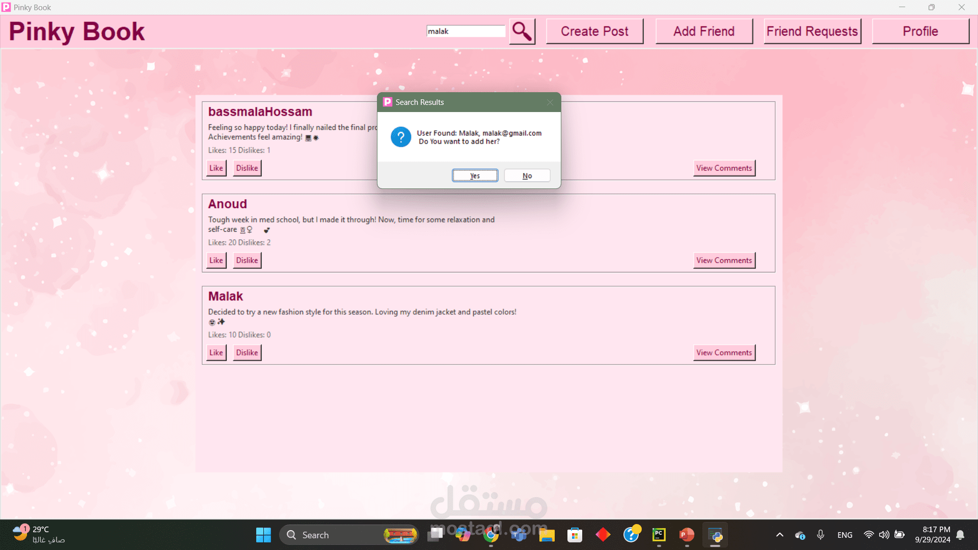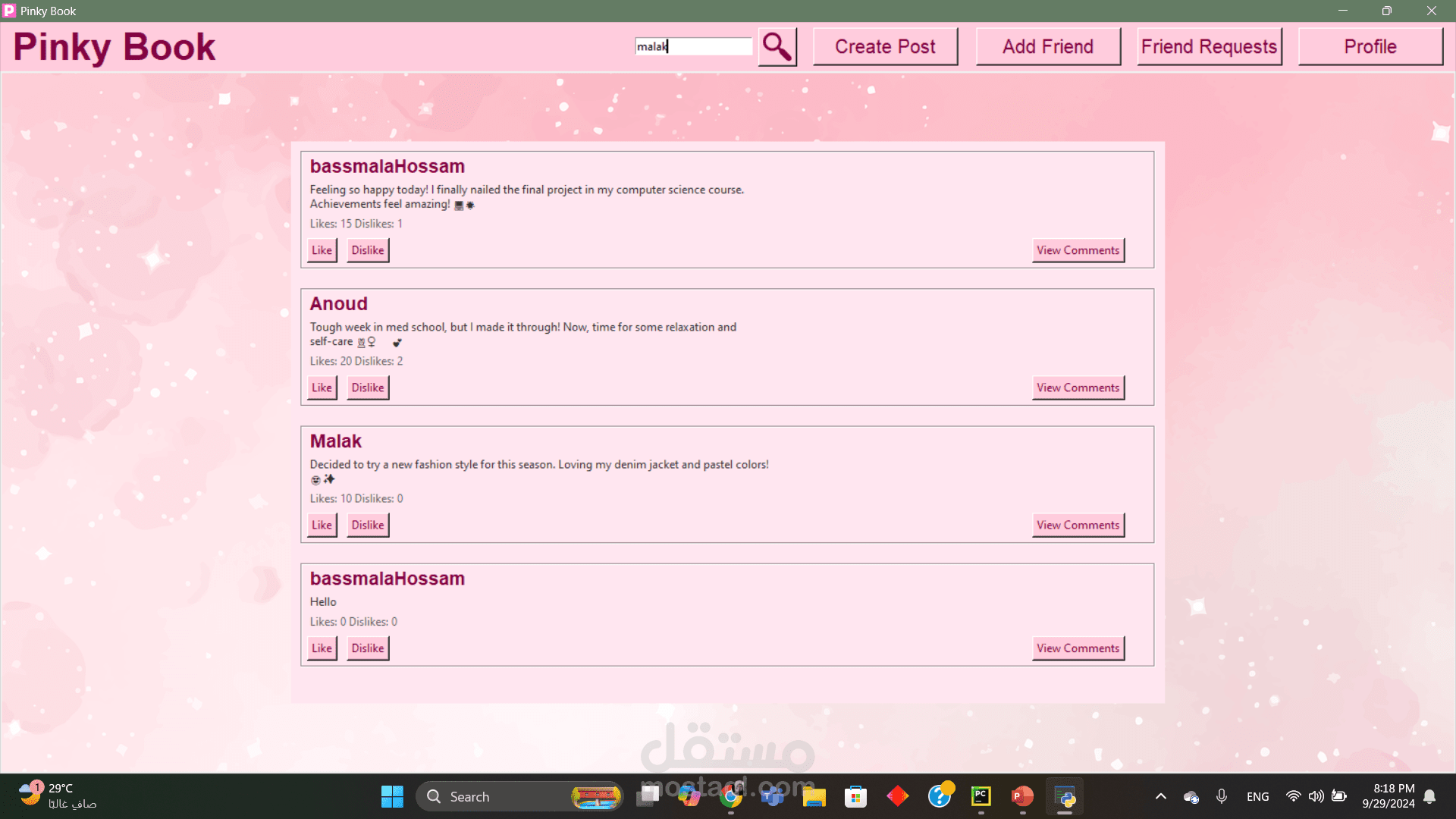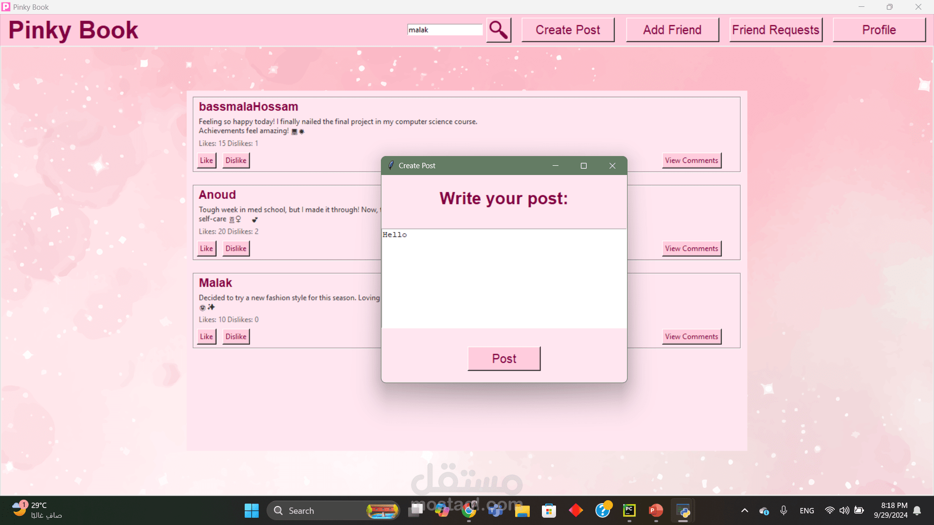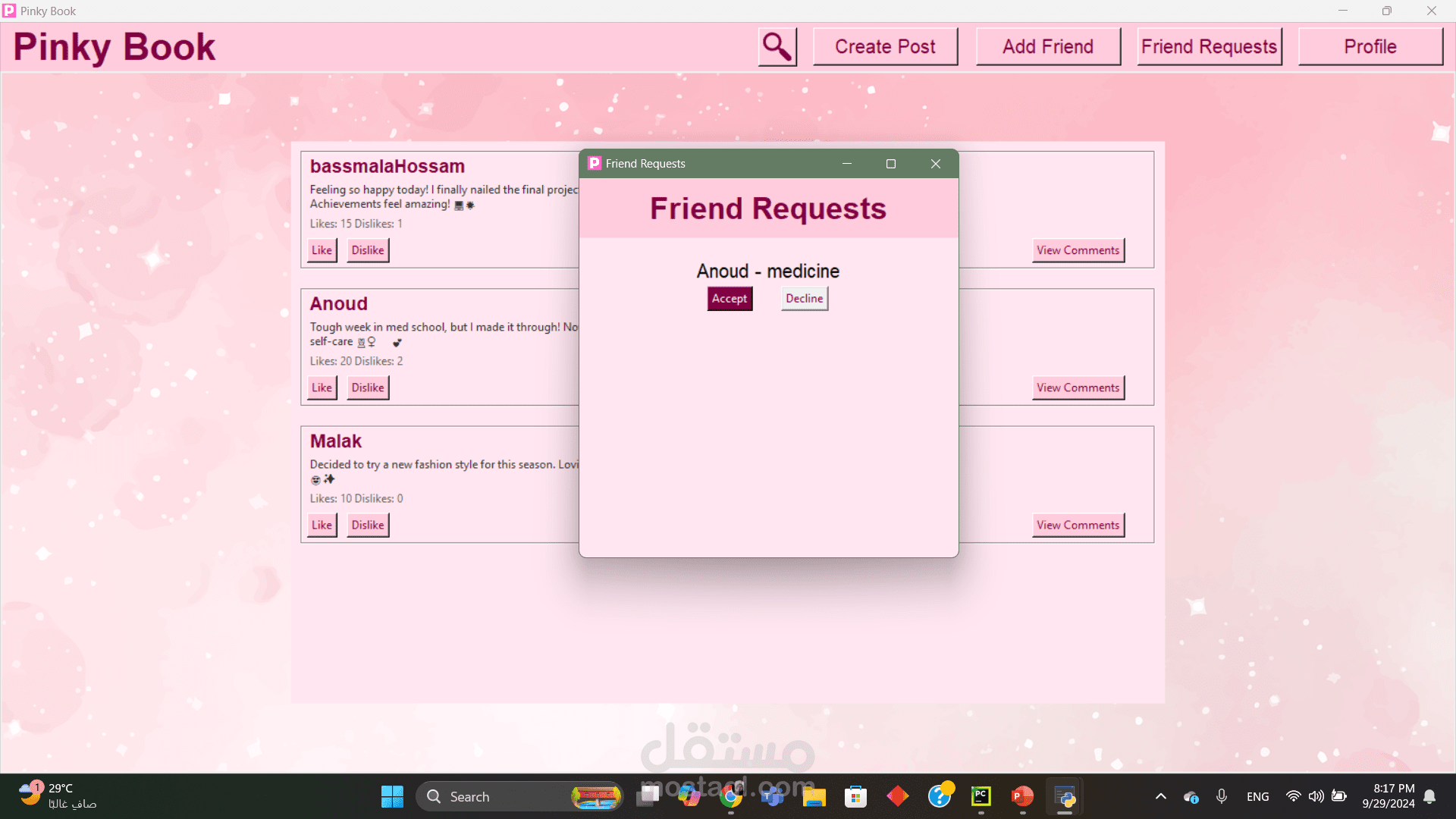 PinkyBook هو تطبيق اجتماعي تم تطويره بلغة Python باستخدام مكتبة Tkinter لتصميم الواجهة الرسومية، مع الاعتماد على JSON لحفظ البيانات محليًا.