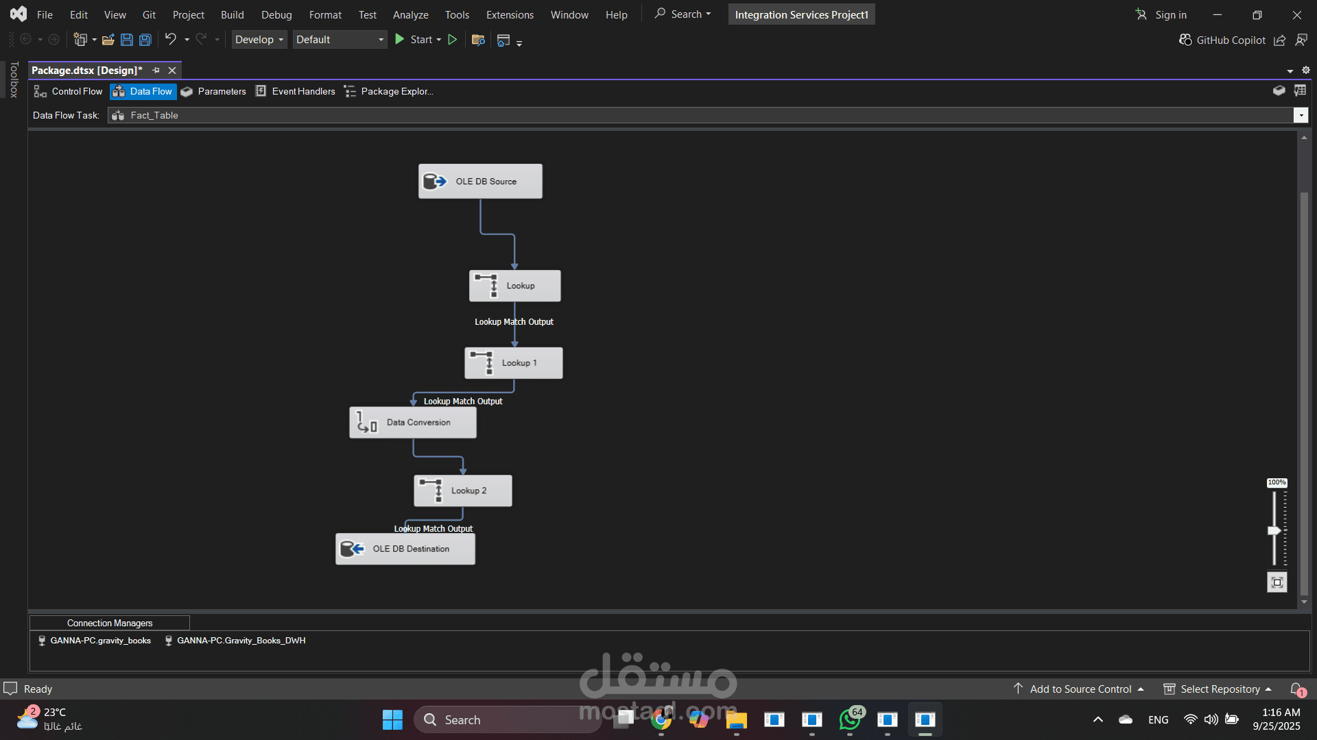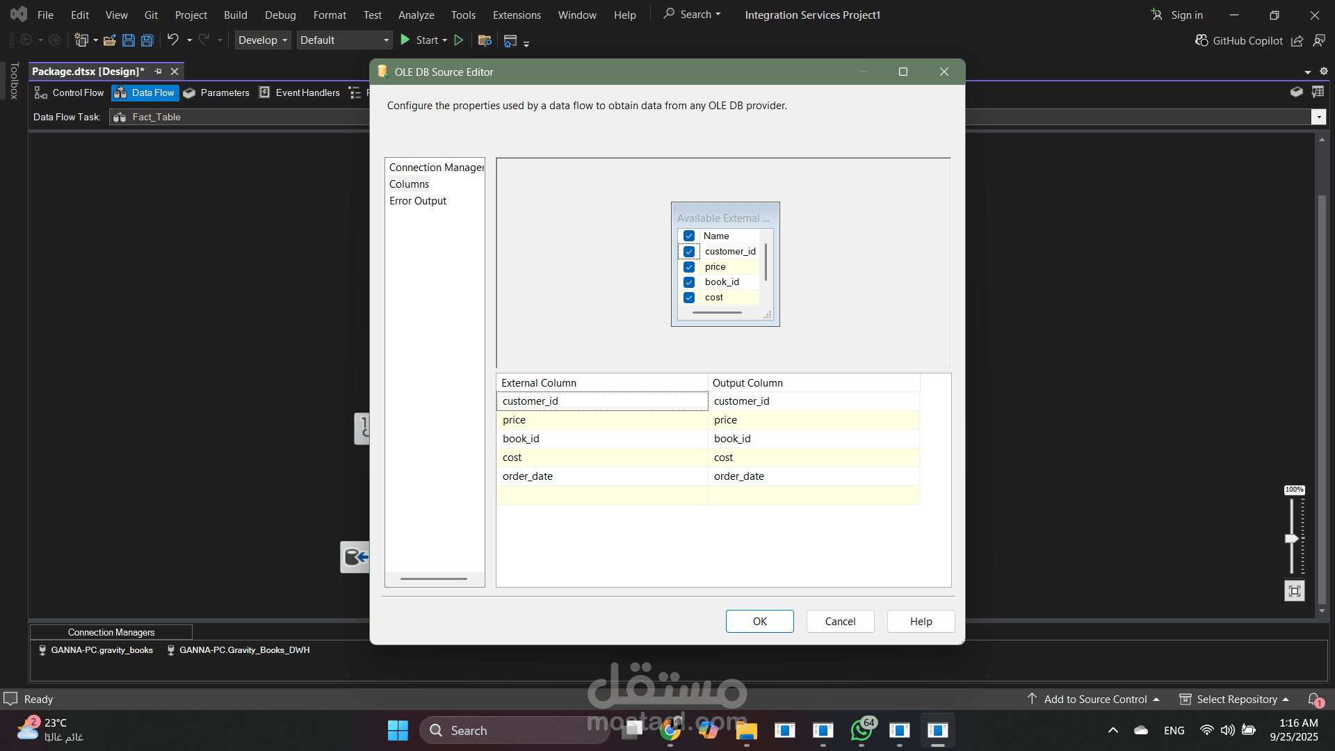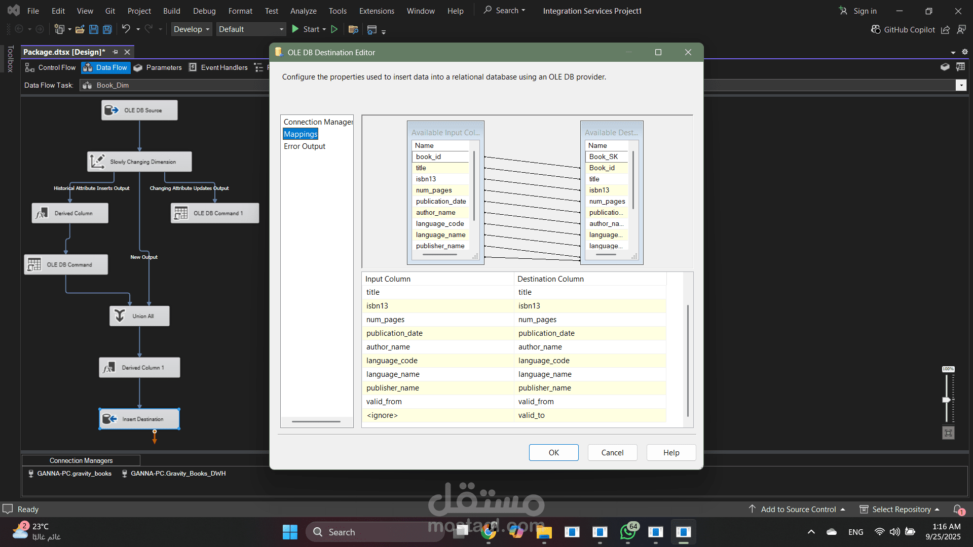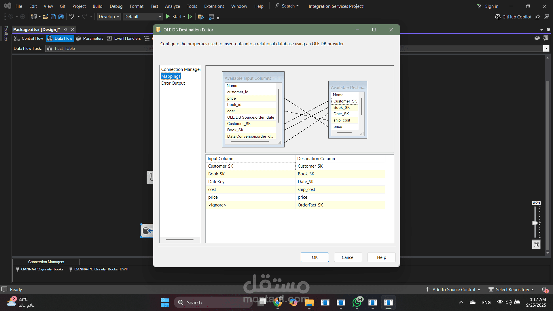 استخدام OLE DB Destination لتحميل البيانات بعد معالجتها إلى قاعدة بيانات اسمها Gravity_Books_DWH.