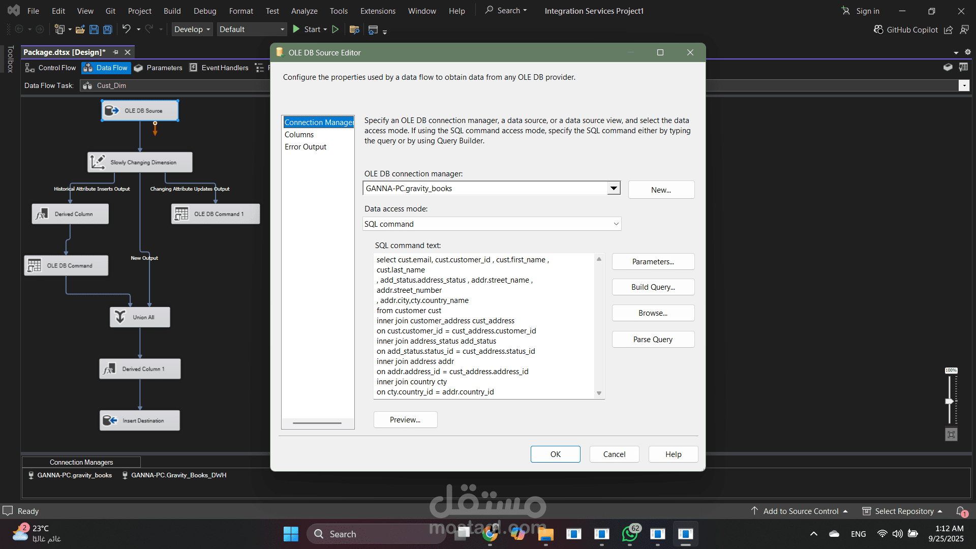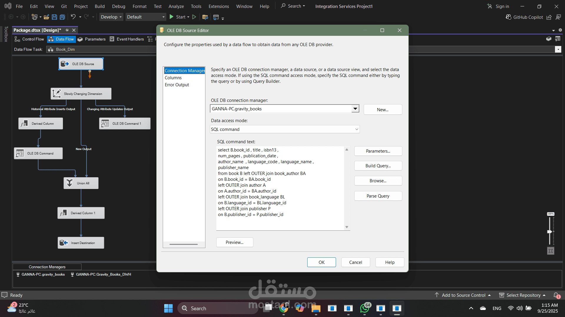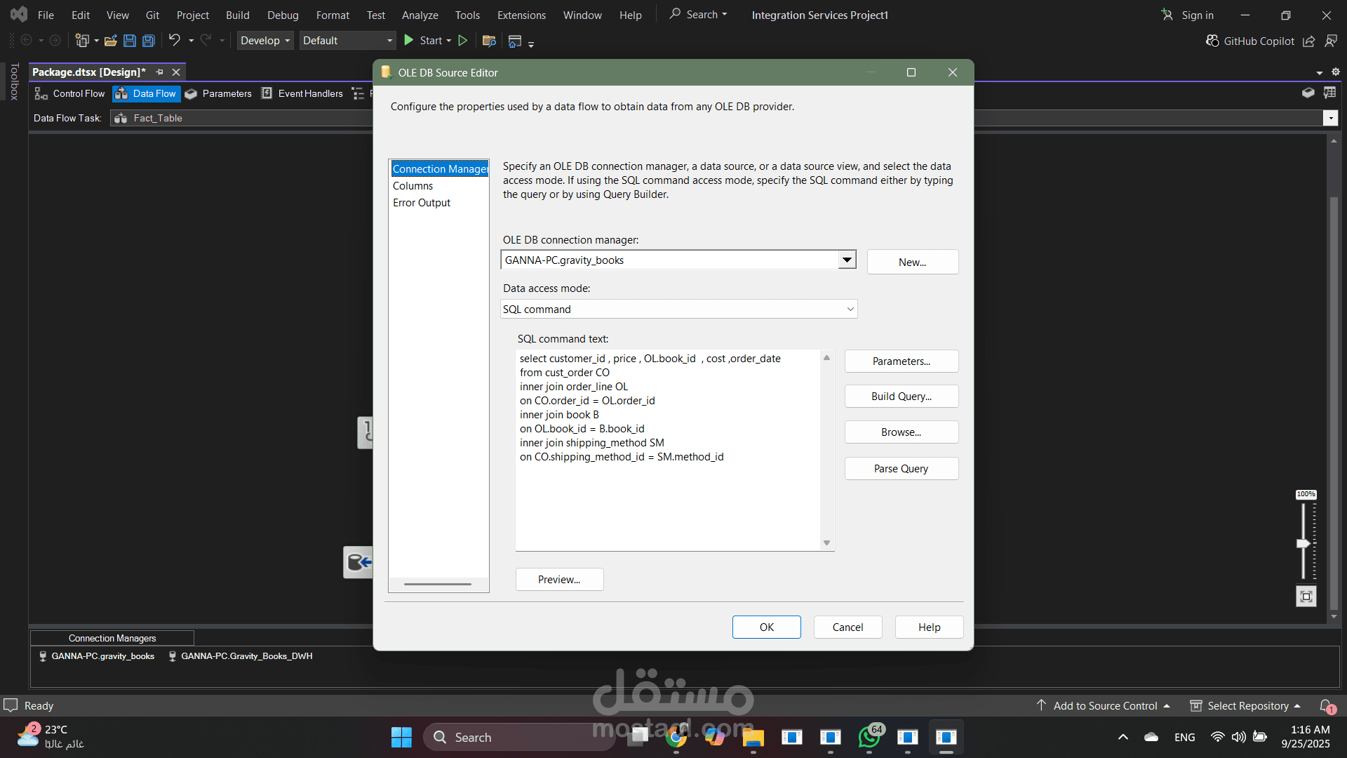 استخدام مكون OLE DB Source لسحب البيانات من قاعدة بيانات اسمها gravity_books.