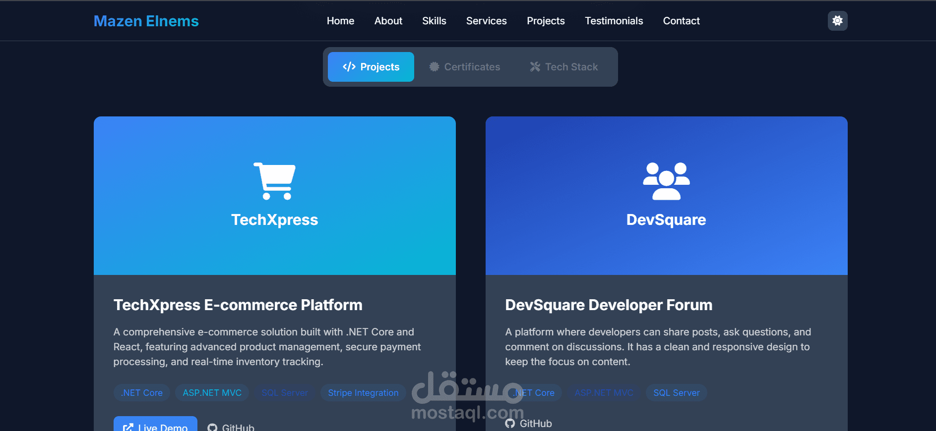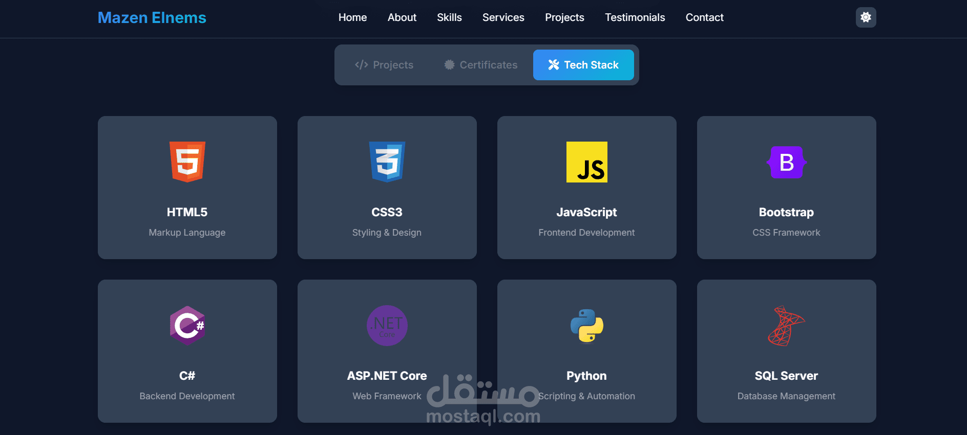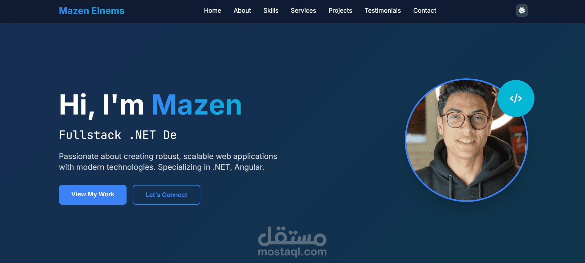 صفحات أساسية: Home ,About, Skills ,Services ,Projects ,Testimonials ,Contact