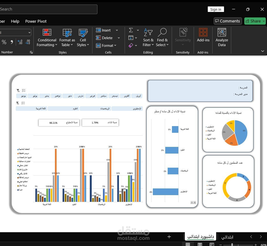 قمت بتصميم ملف Excel متكامل لإدارة ومتابعة أداء المعلمين داخل المؤسسات التعليمية، واللي بيجمع بين الدقة في التفاصيل وجمال العرض المرئي.