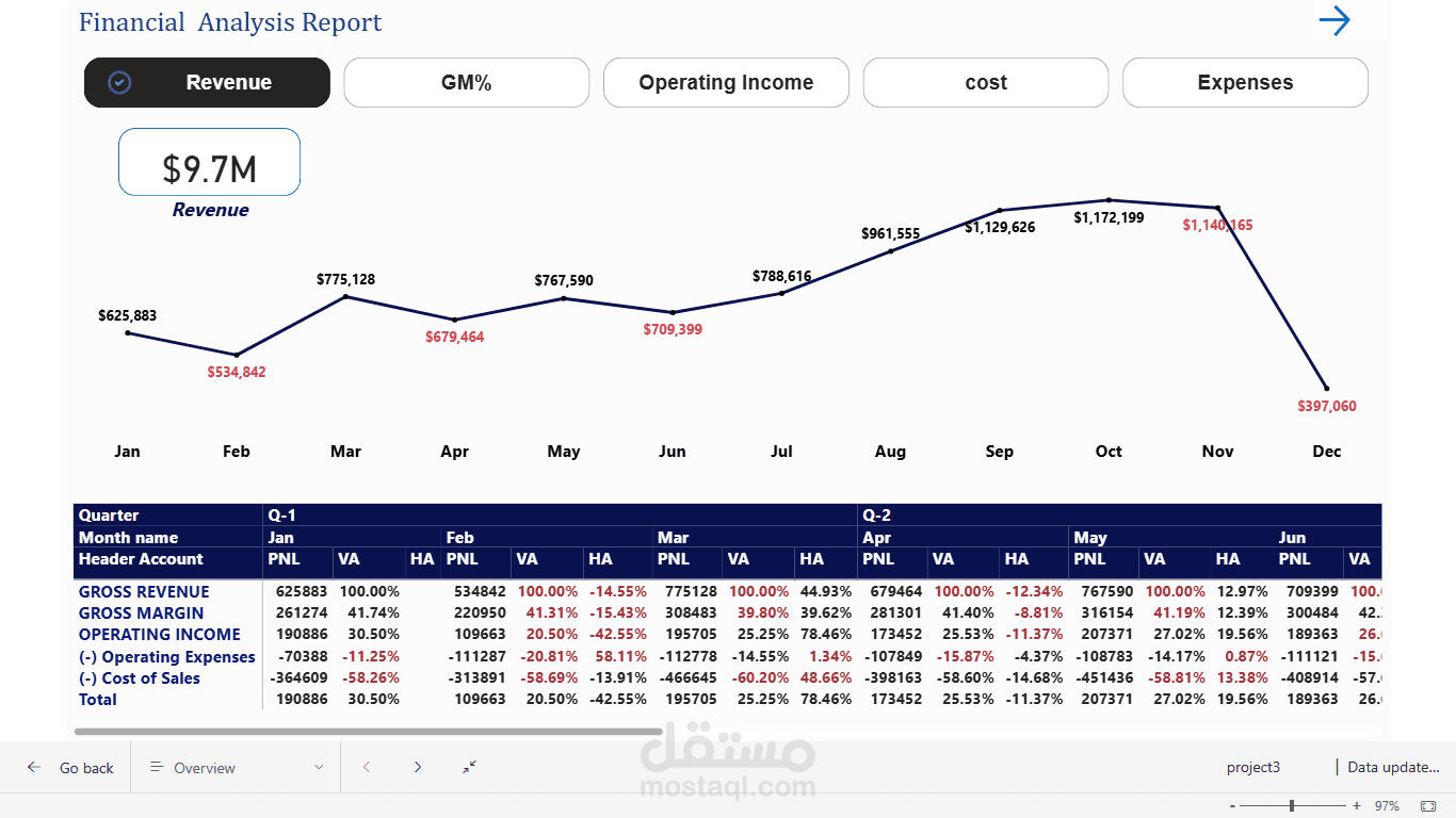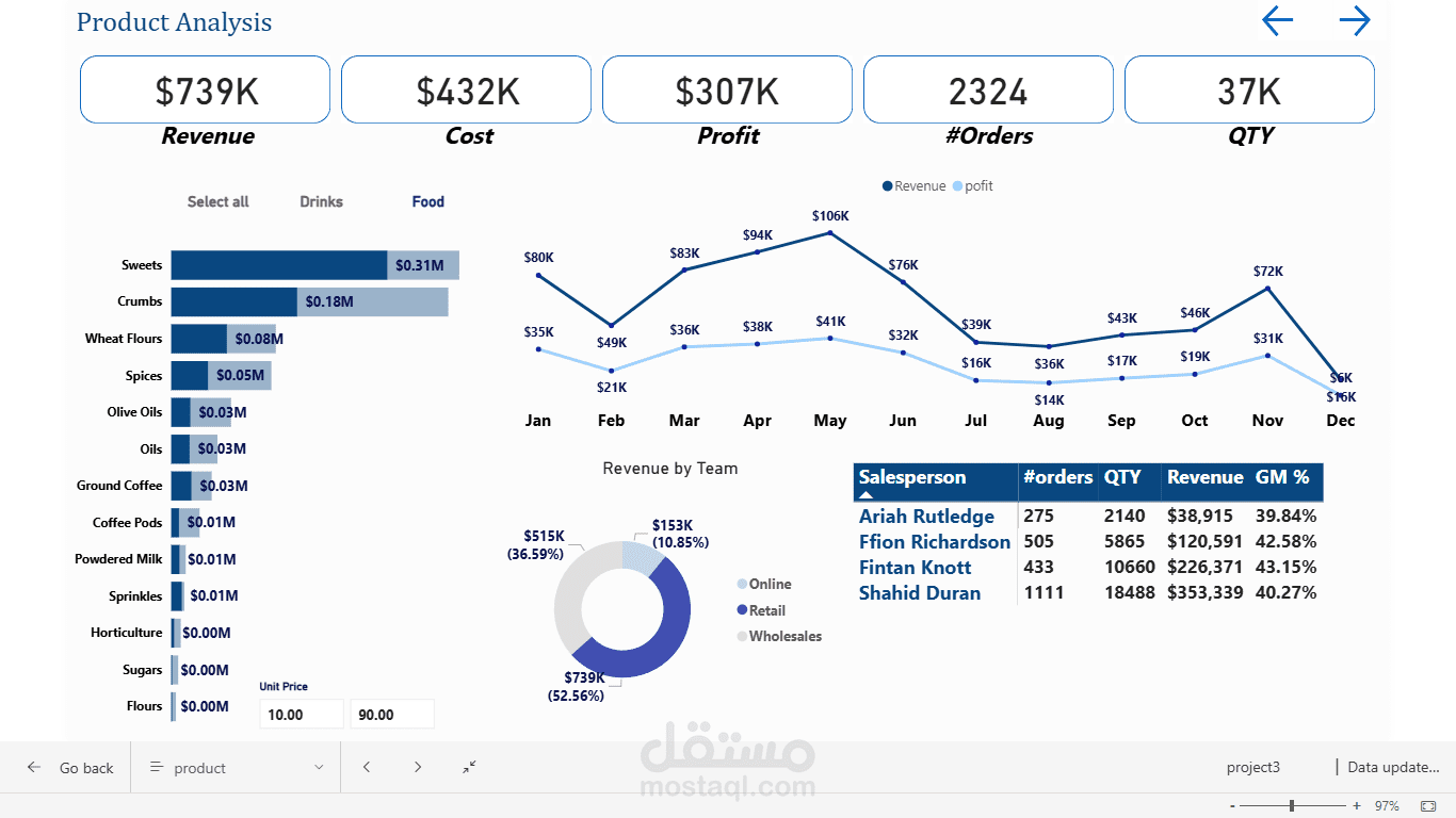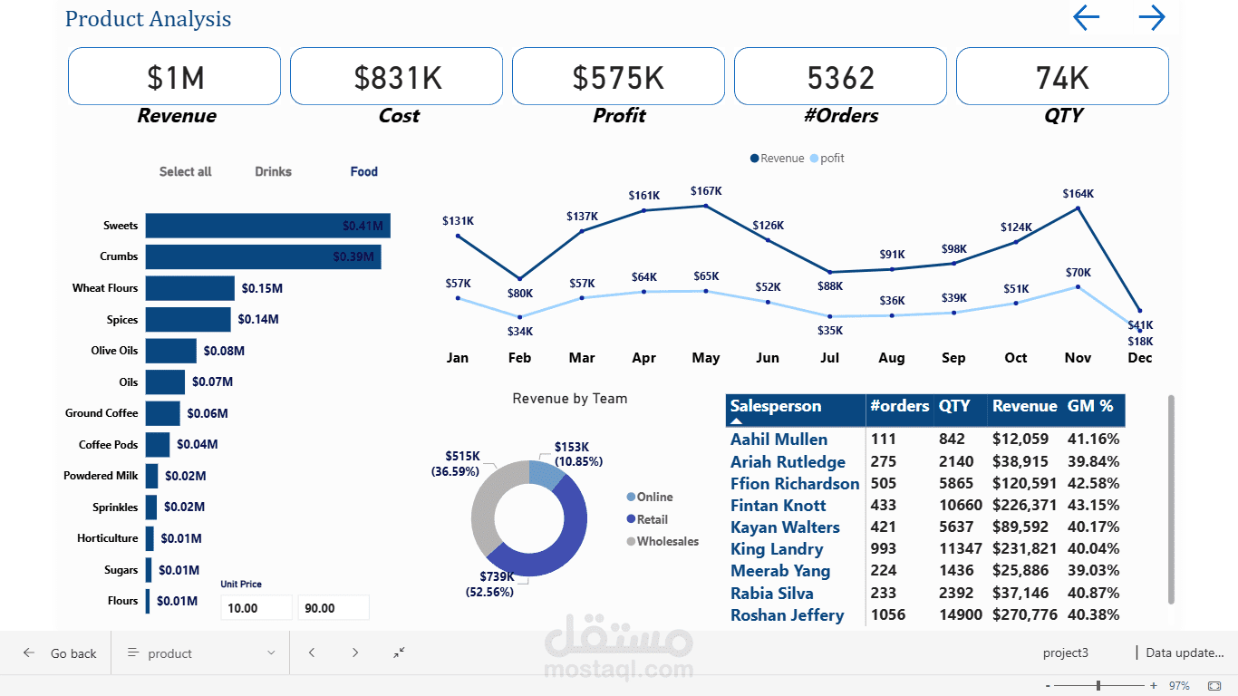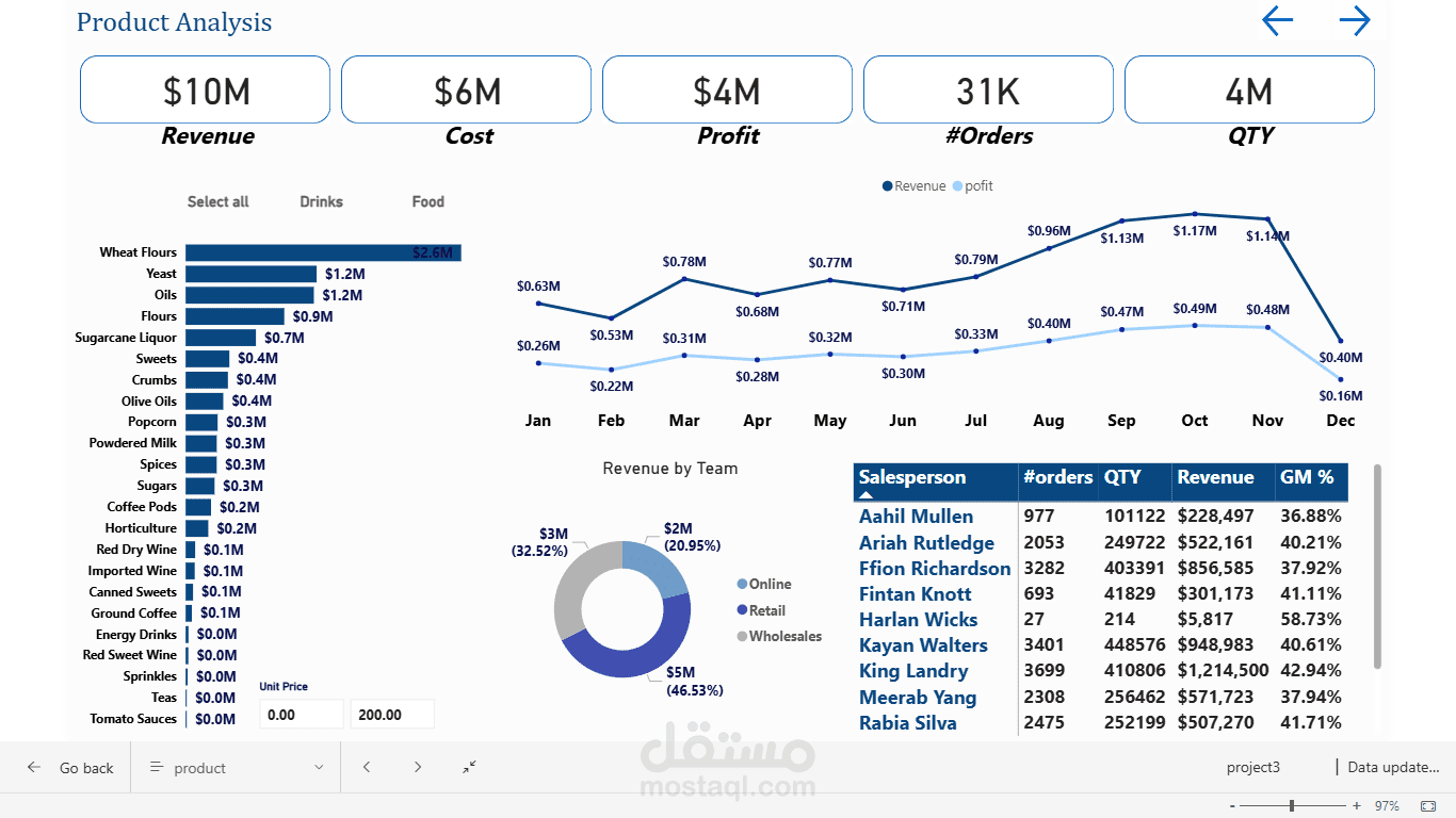 Revenue & Gross Margin tracking by month, category, supplier, and team