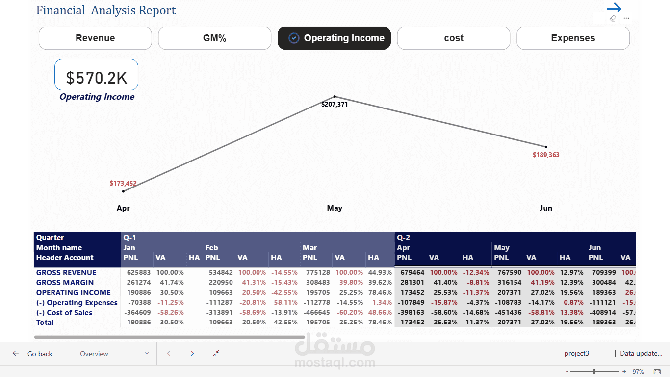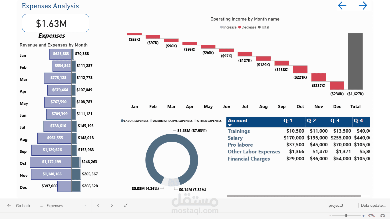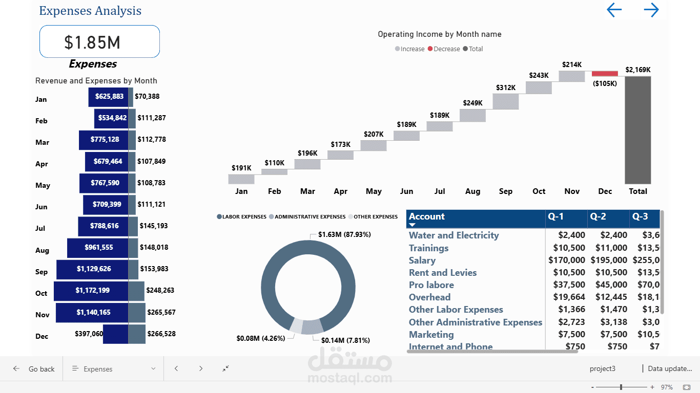 Clear storytelling through bar charts, donut charts, waterfall, and KPI cards