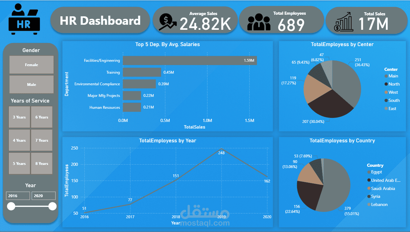 قمت بتصميم لوحة معلومات (HR Dashboard) تفاعلية متكاملة خاصة بالموارد البشرية والمبيعات، توضح البيانات بشكل بصري جذاب يساعد الإدارة على اتخاذ قرارات مبنية على أرقام دقيقة.