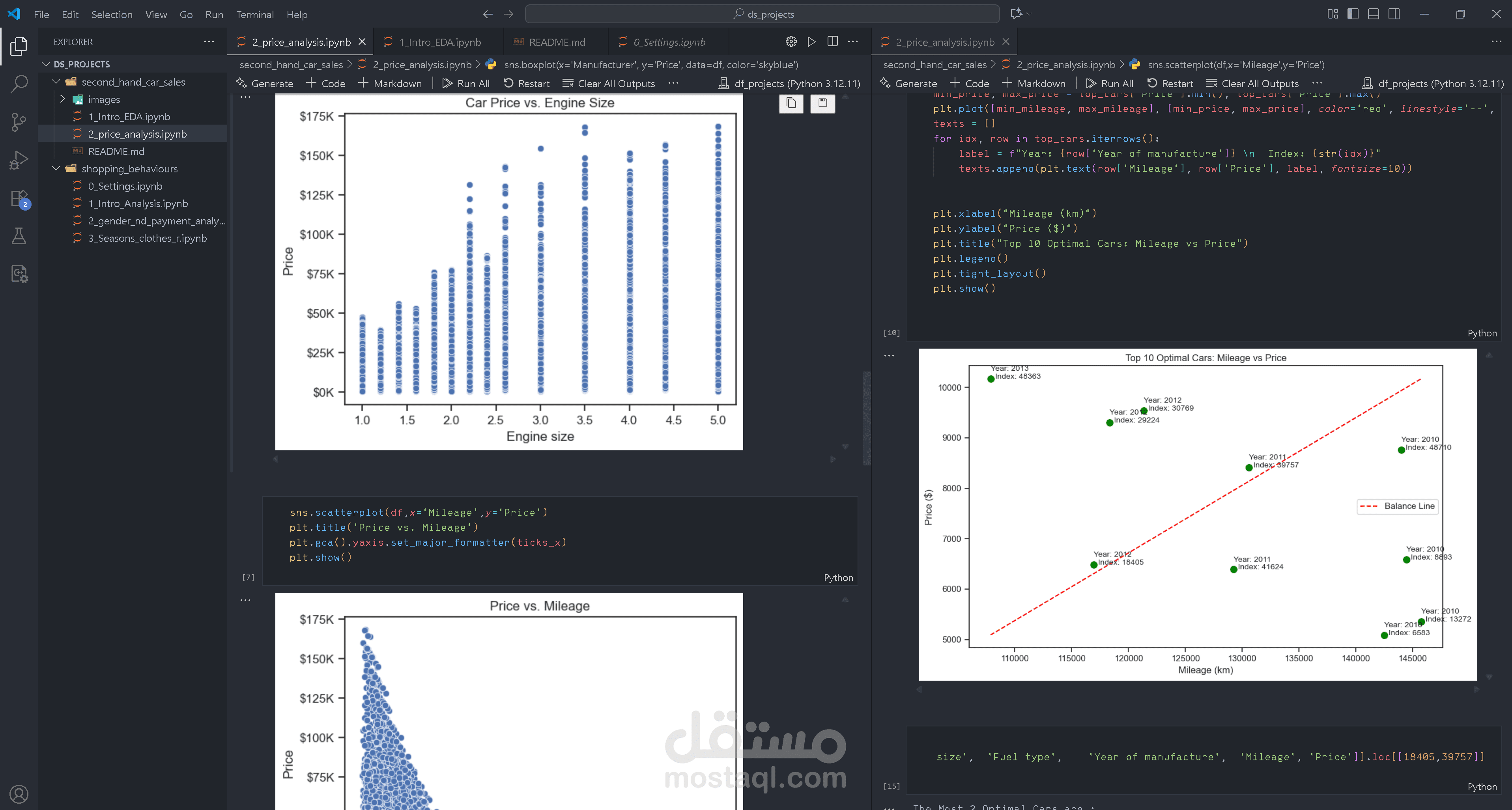 الرسم البياني والتحليلات البصرية: إنشاء مخططات انتشار لأفضل 10 سيارات مع “خط التوازن” لتحديد أفضل توازن بين المسافة والسعر.